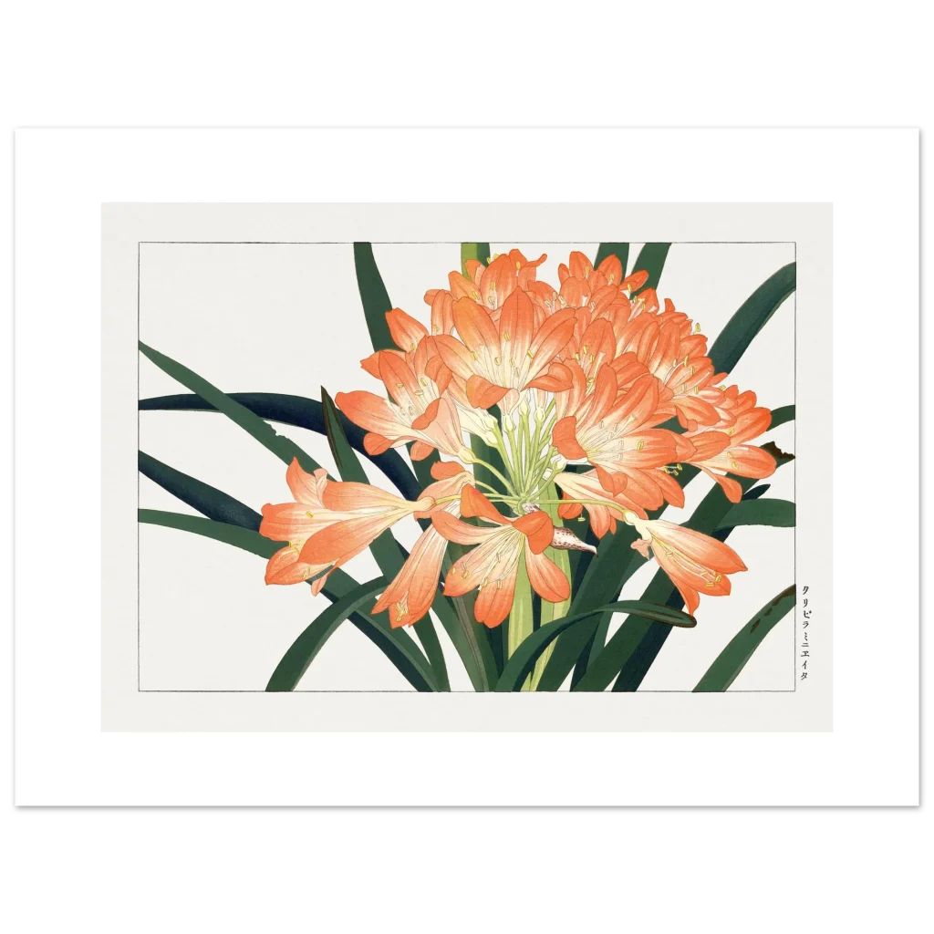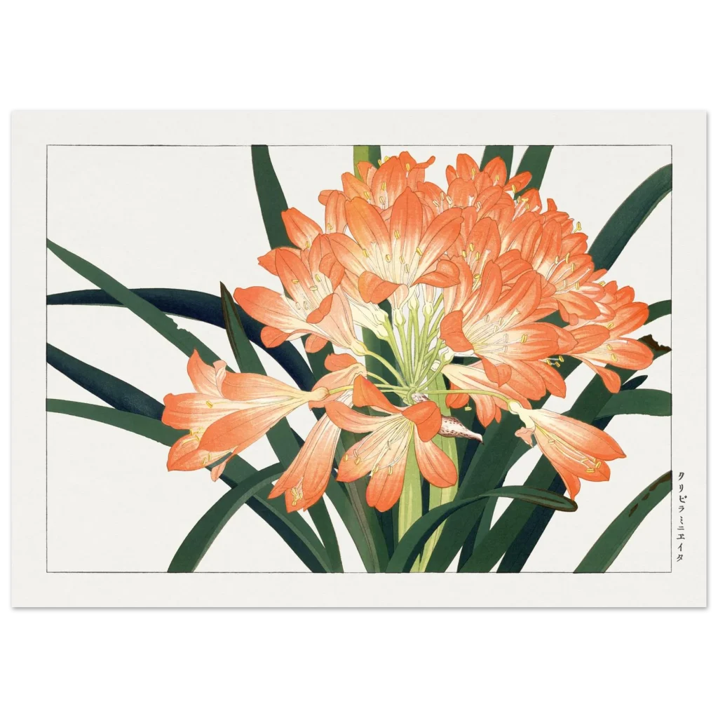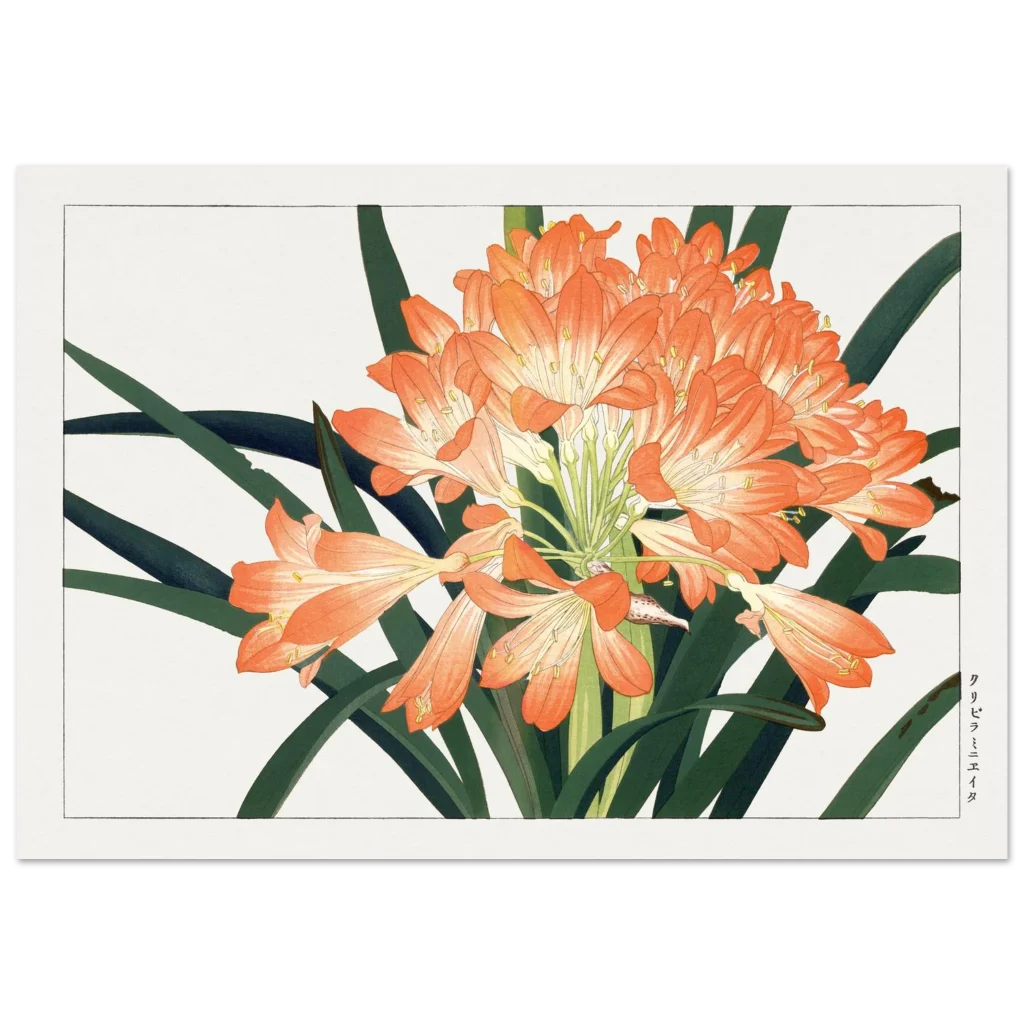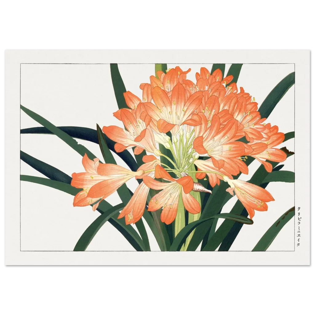 Bring the timeless beauty of Japanese botanical art into your home with this stunning Clivia Miniata print. The vibrant orange blooms, set against deep green foliage, evoke a serene yet lively elegance, perfect for adding a touch of nature-inspired sophistication to any room.