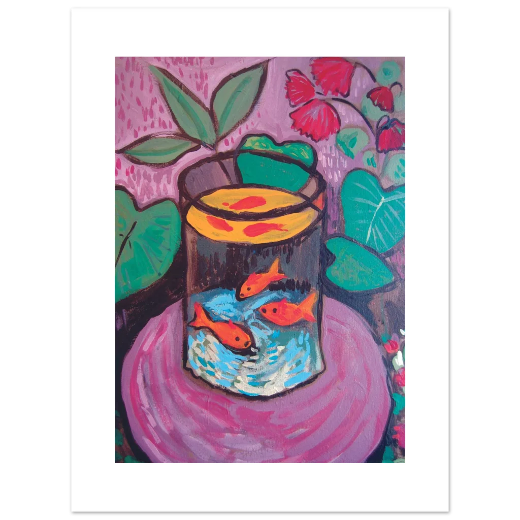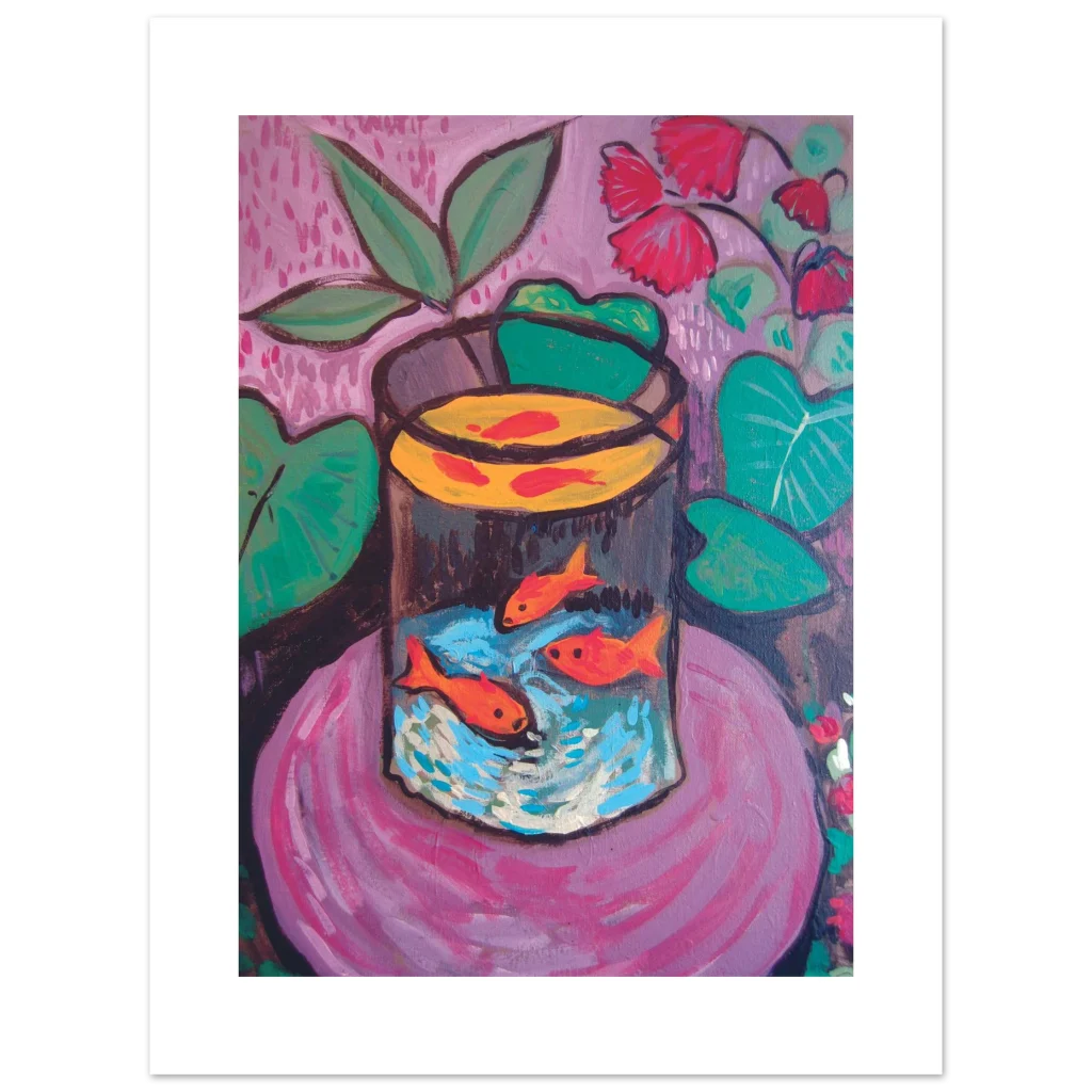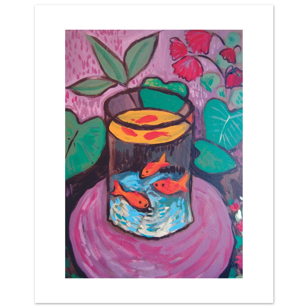 Bring a splash of vivid color and whimsical charm to your living space with this captivating art print. Featuring lively goldfish swimming in a glass amidst lush green foliage and bright pink flowers, this piece exudes a joyous, expressive energy with its bold brushstrokes and vibrant palette. It’s an instant focal point for any room, perfect for art lovers seeking a unique blend of nature-inspired beauty and contemporary style.