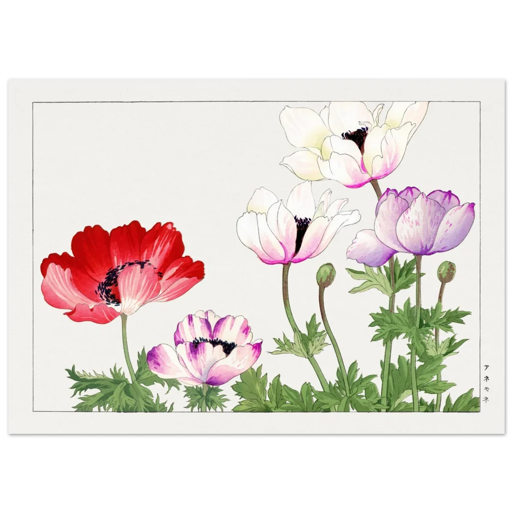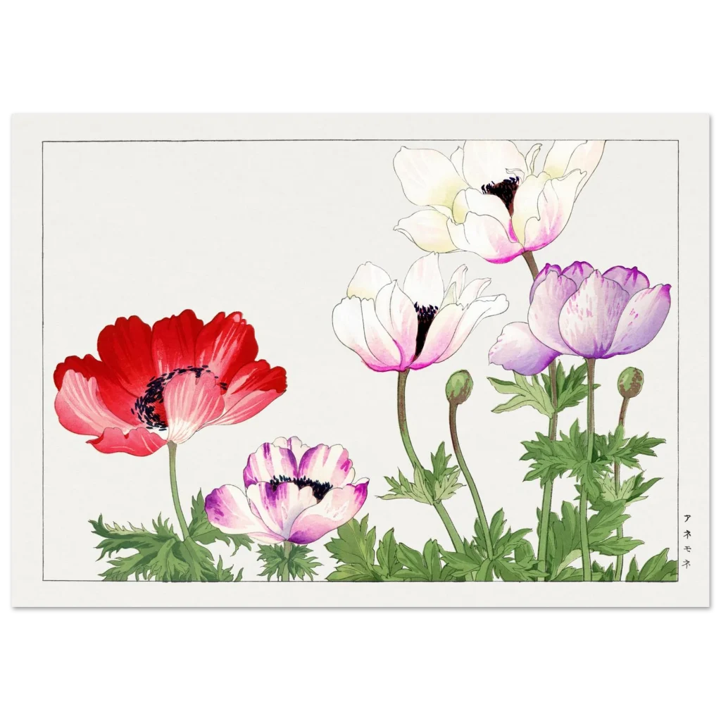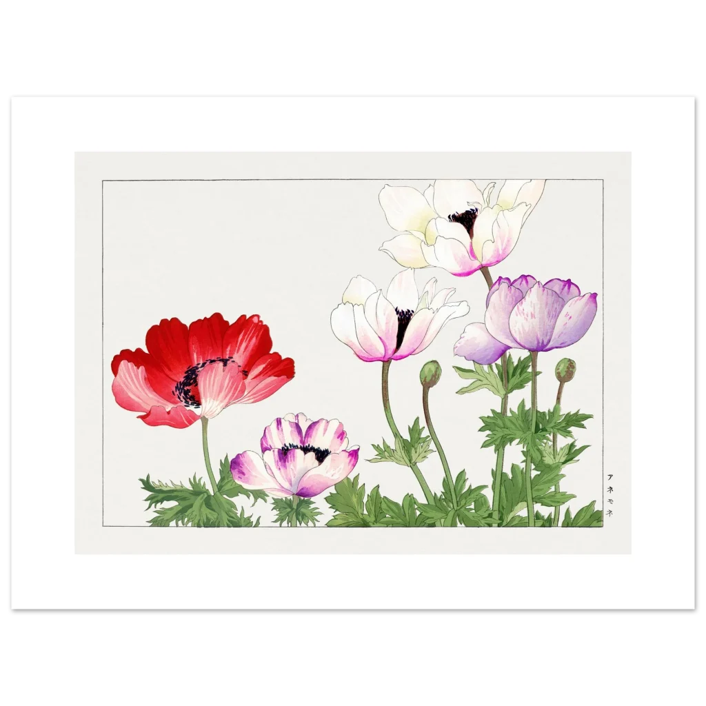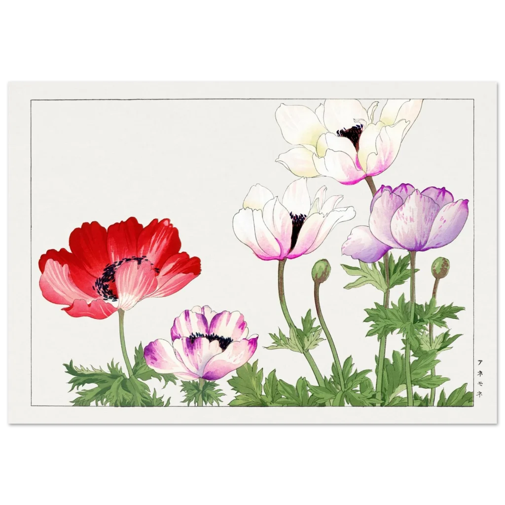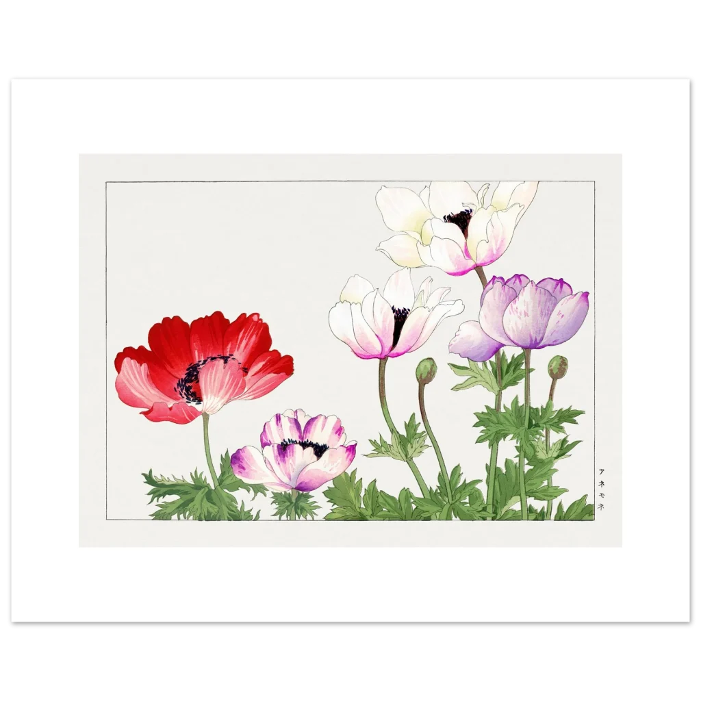 Bring the timeless elegance of Japanese art into your home with our exquisite Anemone Bloom poster. Featuring a delicate array of anemones in stunning reds, soft whites, and gentle purples, this piece captures the serene beauty and vibrant energy of traditional ukiyo-e style botanical illustrations. Perfect for adding a touch of sophisticated calm and color to any living space, bedroom, or office, it invites a moment of peaceful contemplation every day.