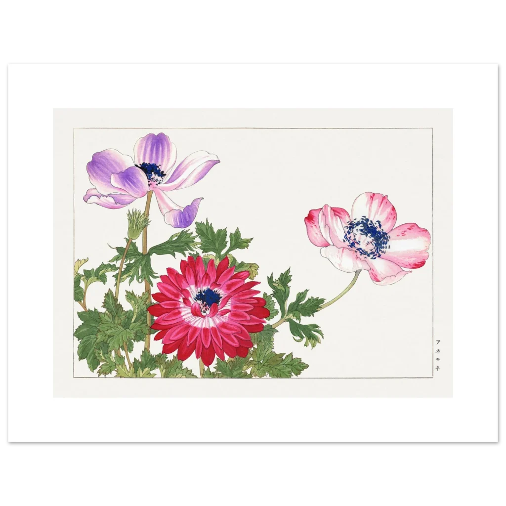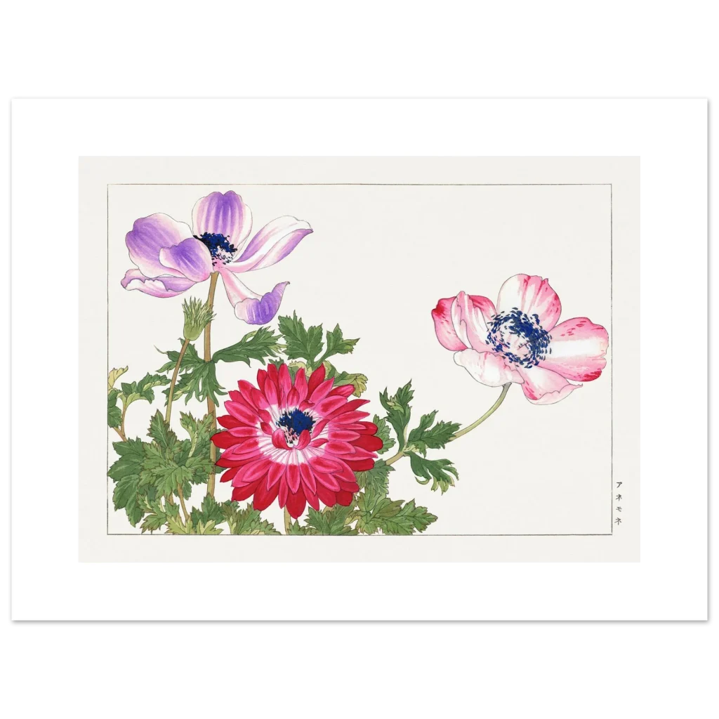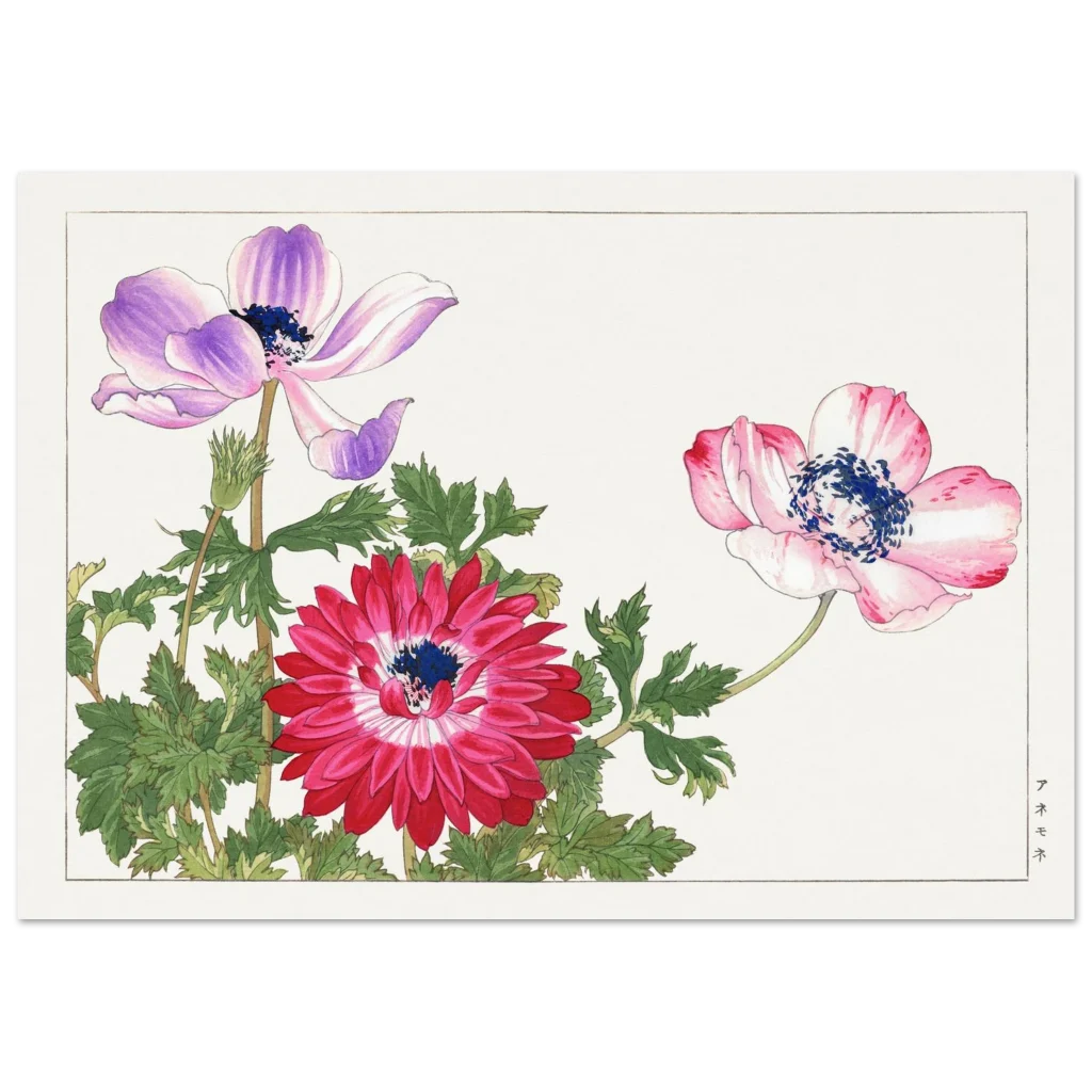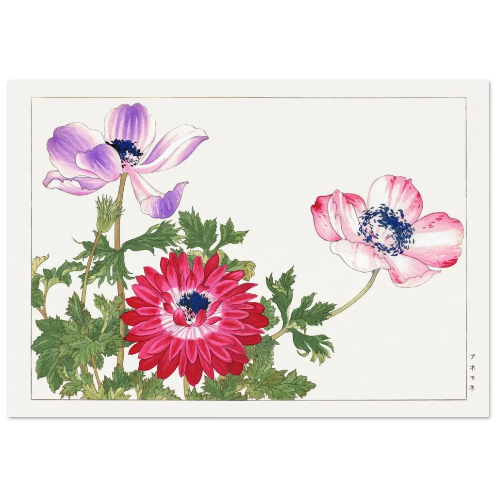 Bring the timeless beauty of Japanese botanical art into your home with this exquisite anemone print. Featuring a lively composition of vivid pink, deep red, and soft lavender anemones, this poster captures the delicate grace and vibrant energy of nature in full bloom. The striking contrast between the petals and the deep blue centers, set against lush green foliage, creates a captivating focal point for any room.