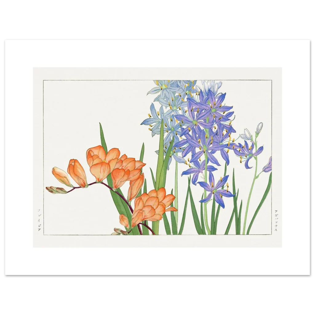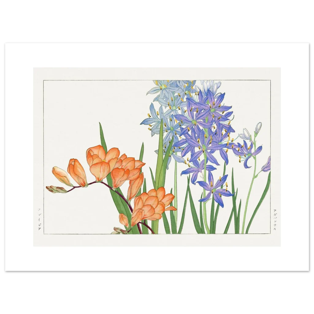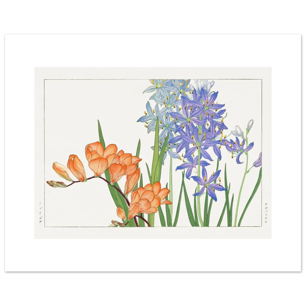 Bring the timeless elegance of Japanese botanical art into your space with this stunning print featuring the delicate beauty of Freesia and Agapanthus. The vibrant orange and serene purple-blue hues, rendered in a classic style, evoke a sense of calm and natural wonder. This exquisite artwork is printed on our premium matte paper, designed to highlight every detail with a luxurious feel.