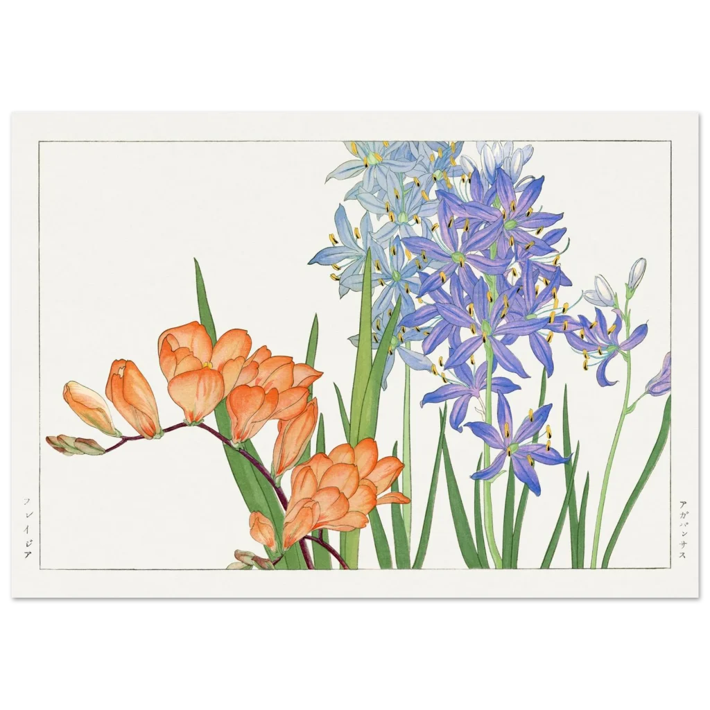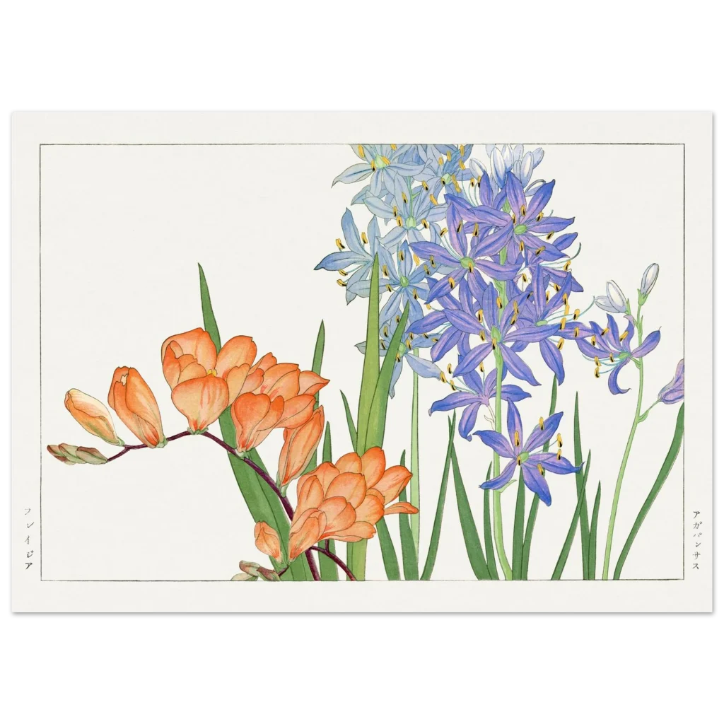 Vibrant Japanese Botanical Art Print: Freesia & Agapanthus Premium Matte Paper Poster