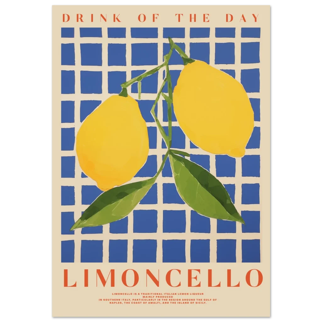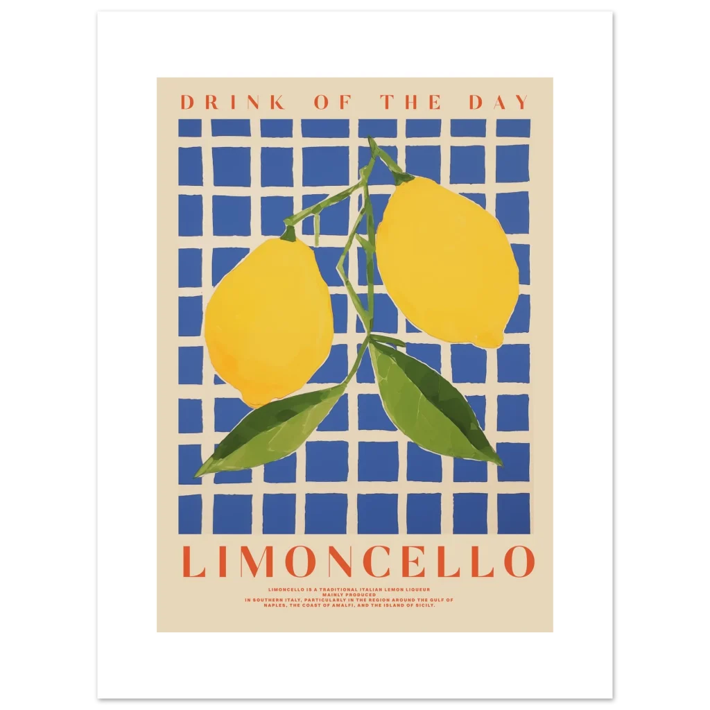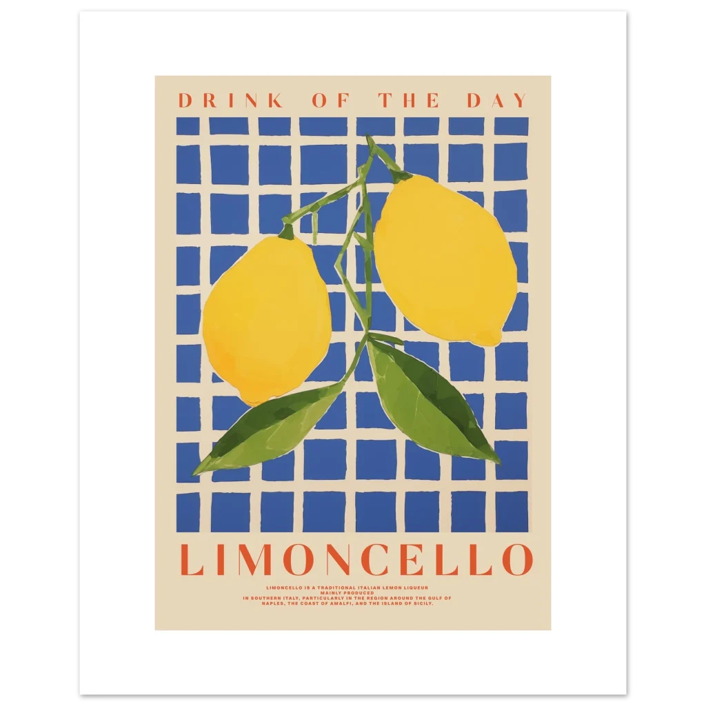 Bring a splash of Italian sunshine and vintage charm into your home with our Limoncello ‘Drink of the Day’ art print. This delightful poster, featuring bright lemons against a captivating blue grid, evokes the joyful spirit of an Amalfi coast summer. Its mid-century modern aesthetic and vivid color palette make it an eye-catching piece for kitchens, dining areas, or any space needing a pop of cheerful sophistication.
