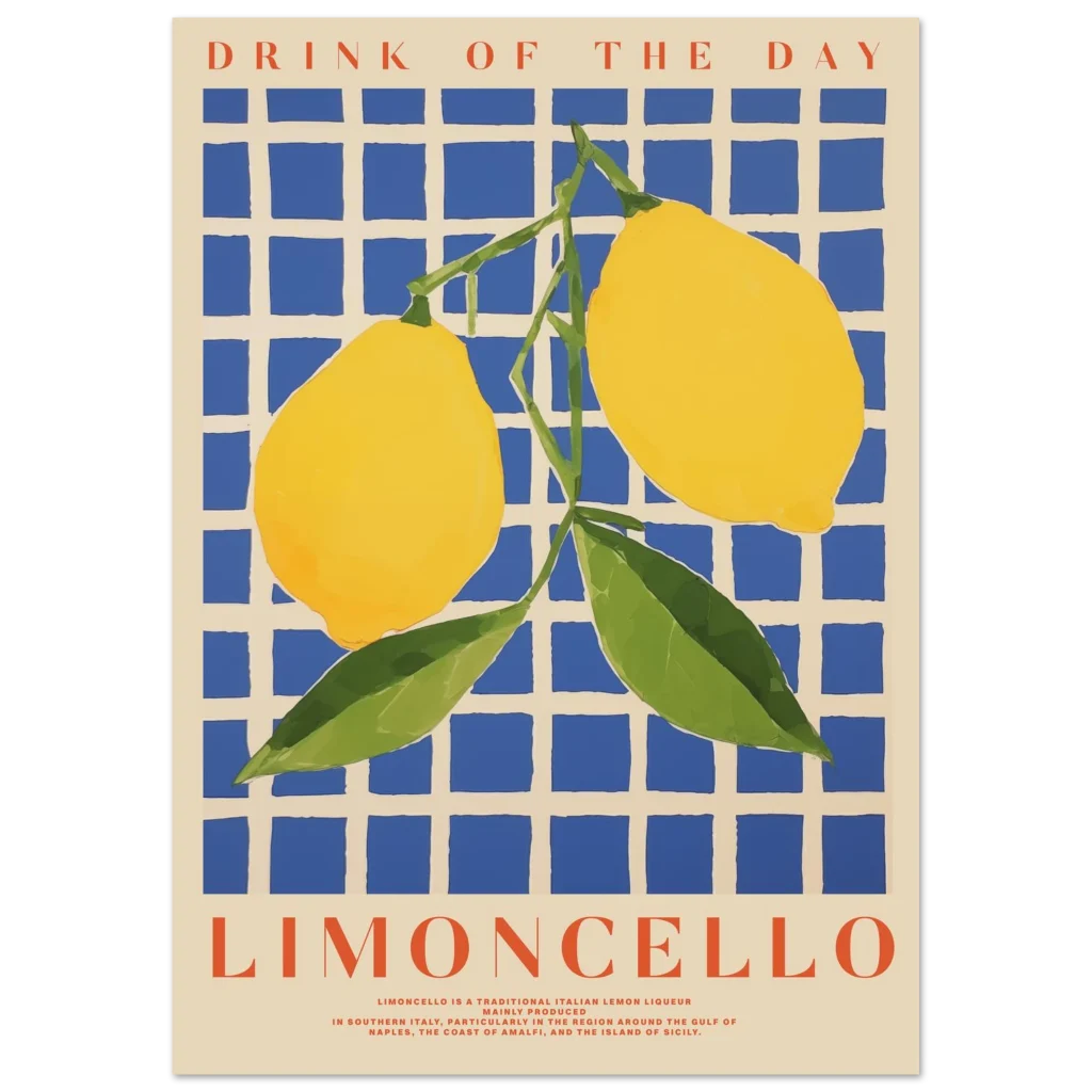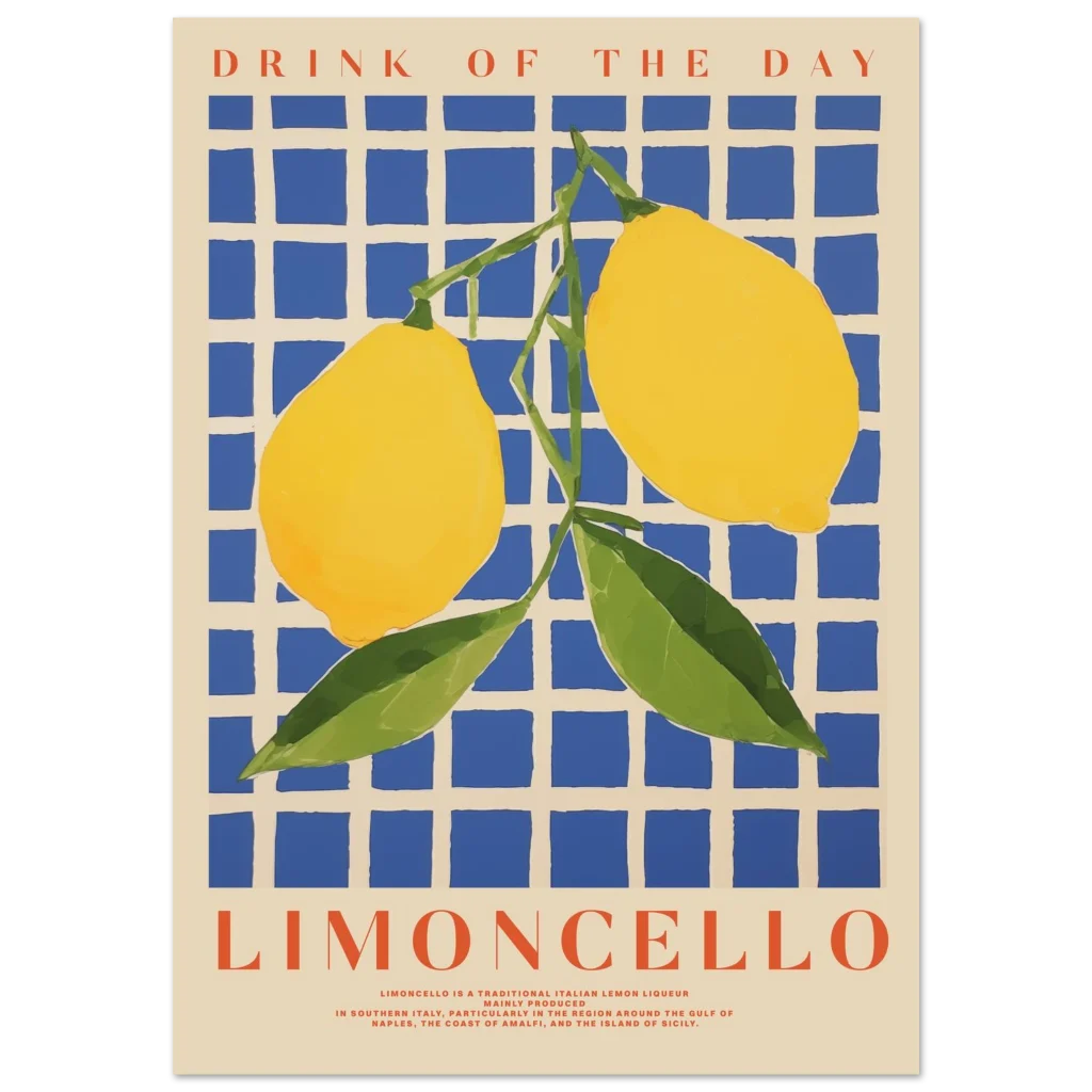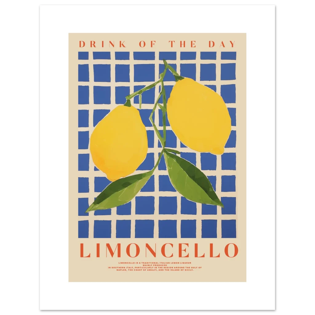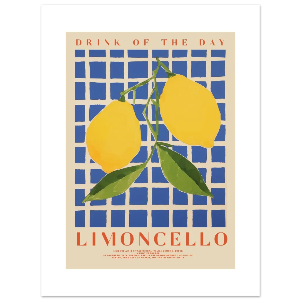 Bring a splash of Italian sunshine and vintage charm into your home with our Limoncello ‘Drink of the Day’ art print. This delightful poster, featuring bright lemons against a captivating blue grid, evokes the joyful spirit of an Amalfi coast summer. Its mid-century modern aesthetic and vivid color palette make it an eye-catching piece for kitchens, dining areas, or any space needing a pop of cheerful sophistication.