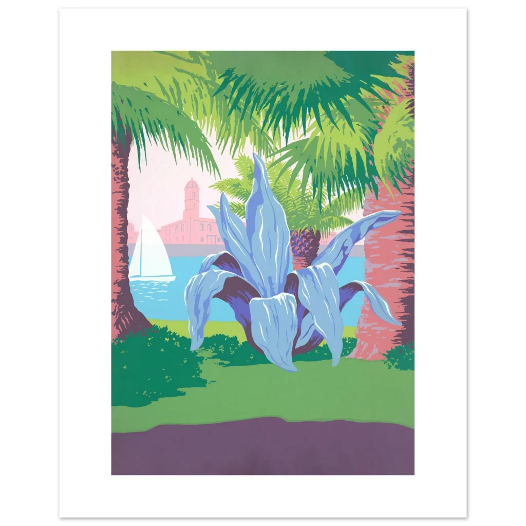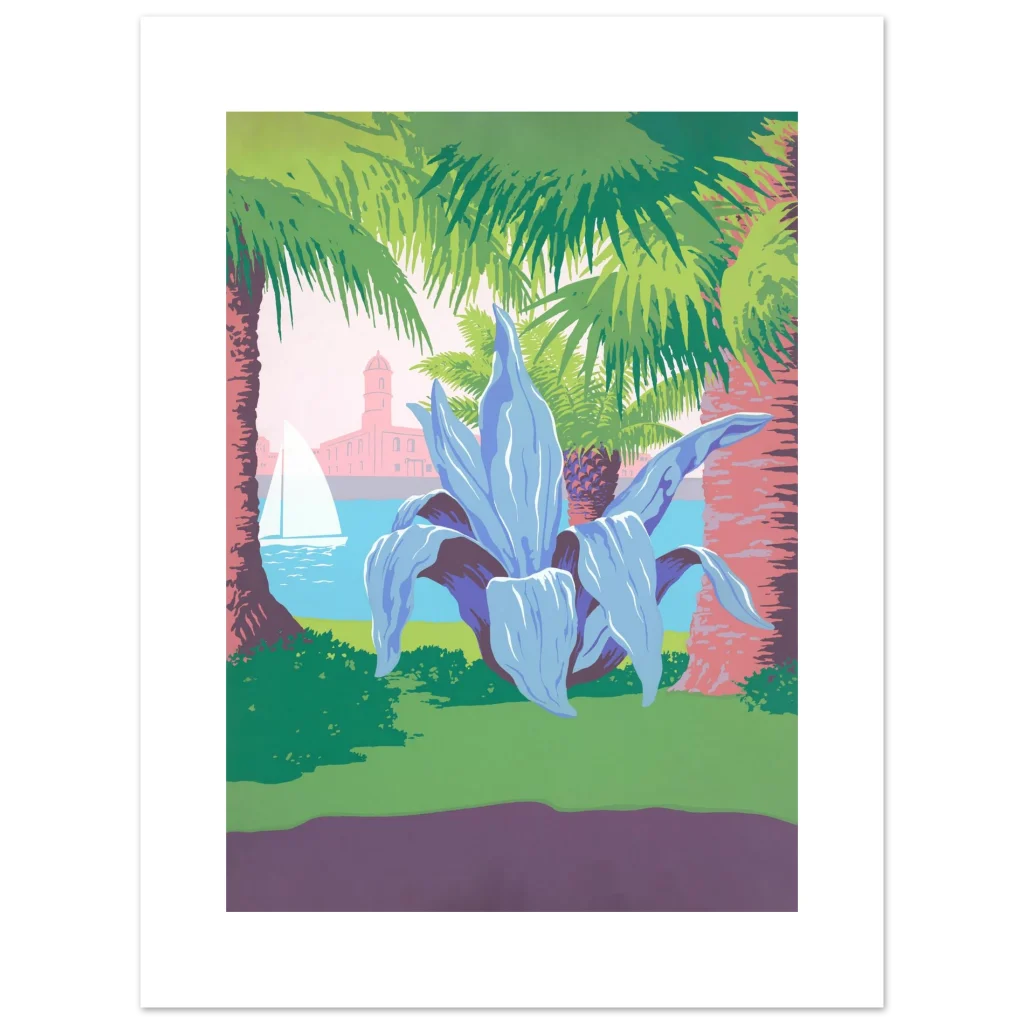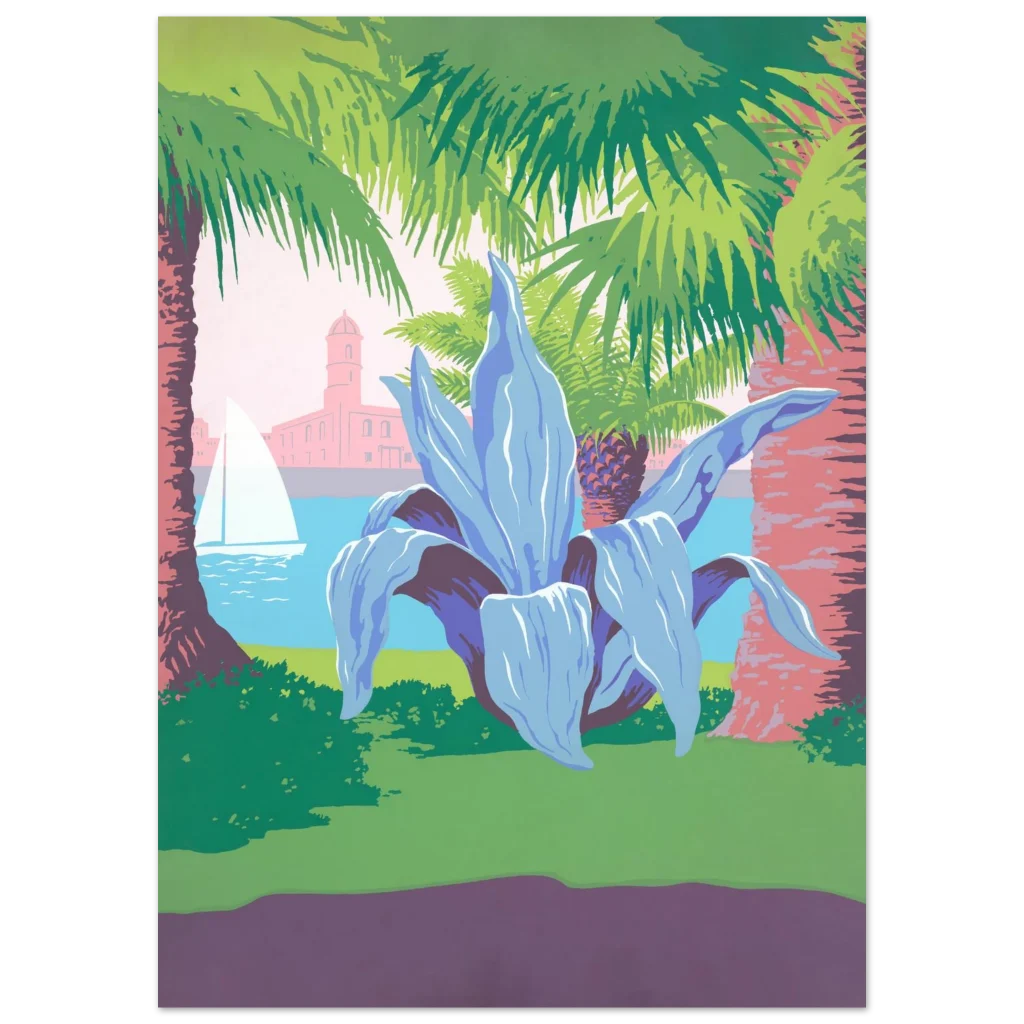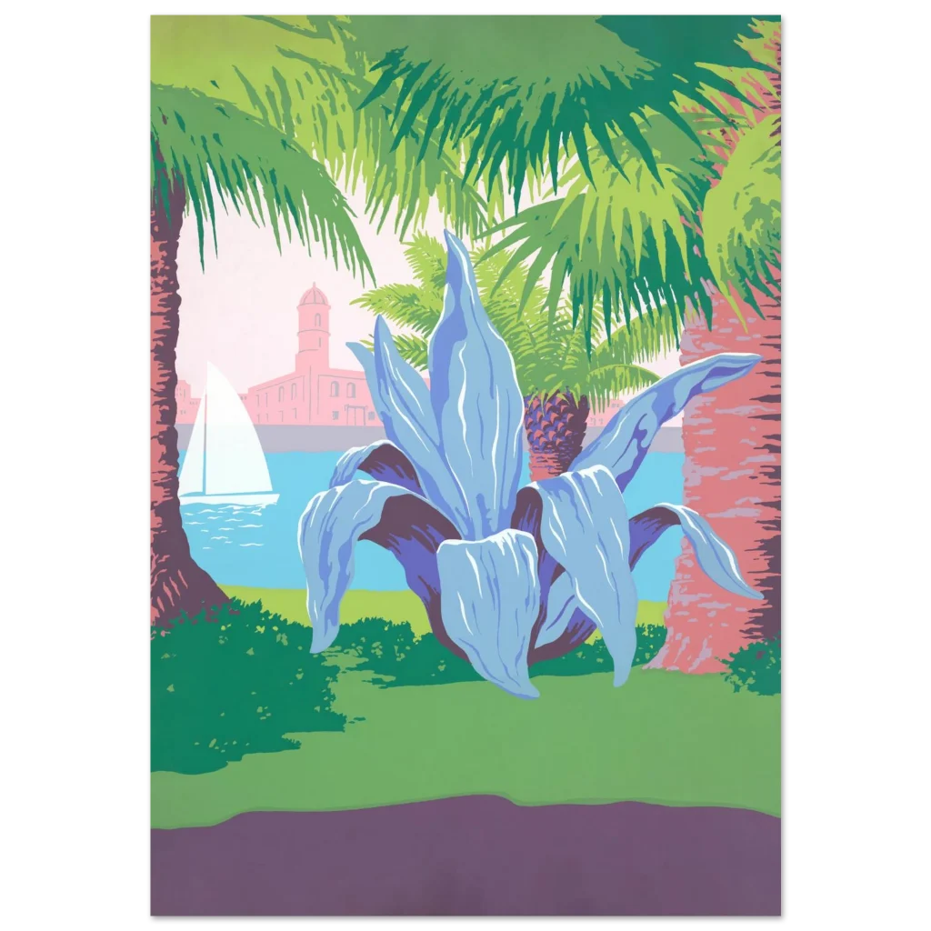 Vibrant Mediterranean Vista Poster: Retro Travel Art with Palm Trees & Agave, in Your Preferred Size