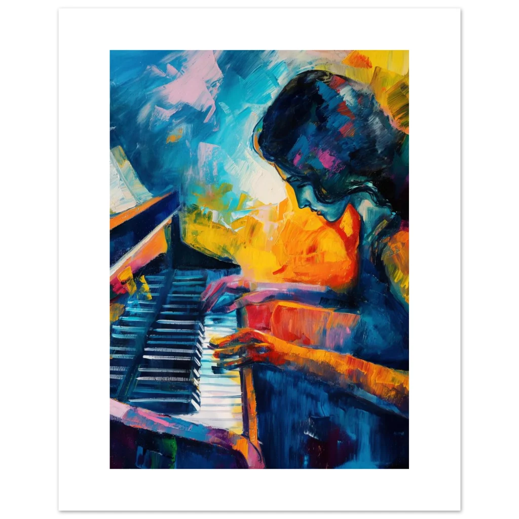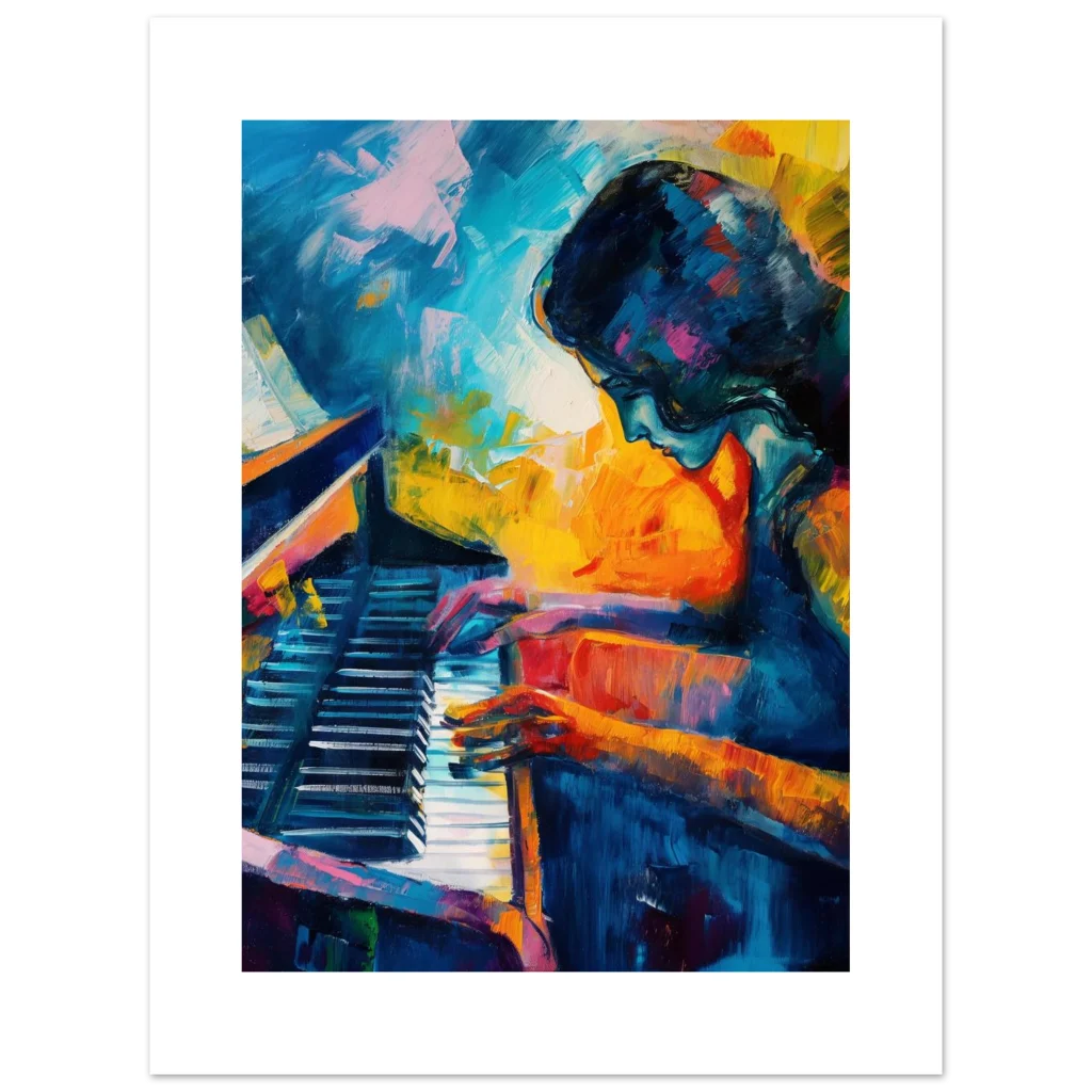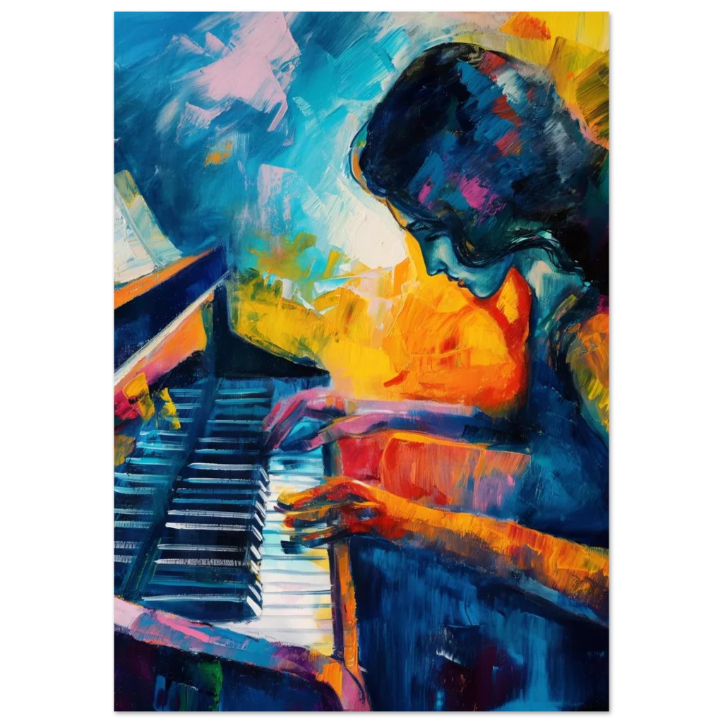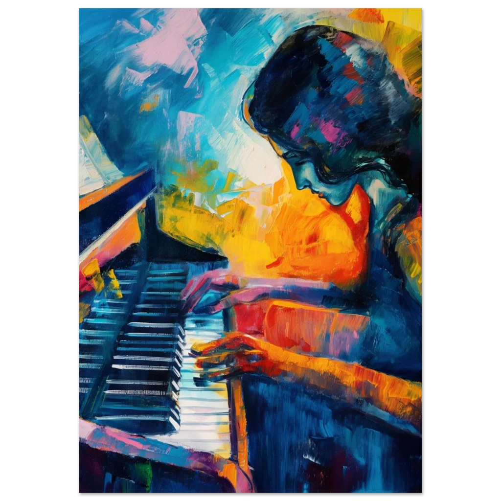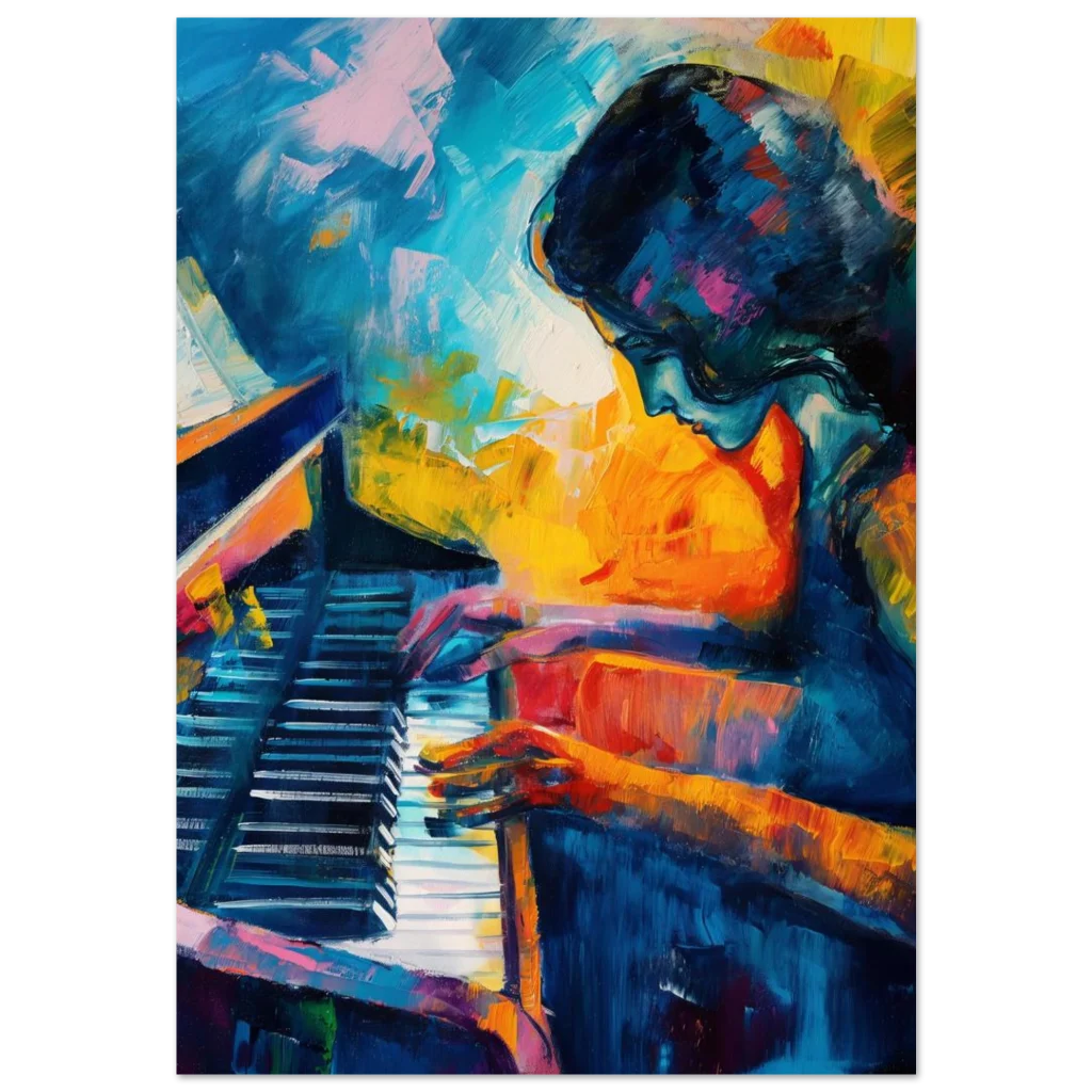 Immerse yourself in the vivid emotion and captivating energy of our ‘Vibrant Palette Piano Player’ poster. This expressive abstract art piece, bursting with rich blues, fiery oranges, and dynamic brushstrokes, captures the soulful moment of a musician lost in melody. It’s more than just a print; it’s a statement piece designed to infuse your home or studio with passion and artistic flair.