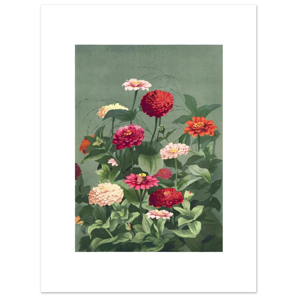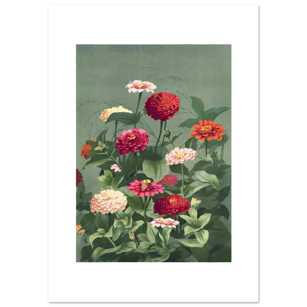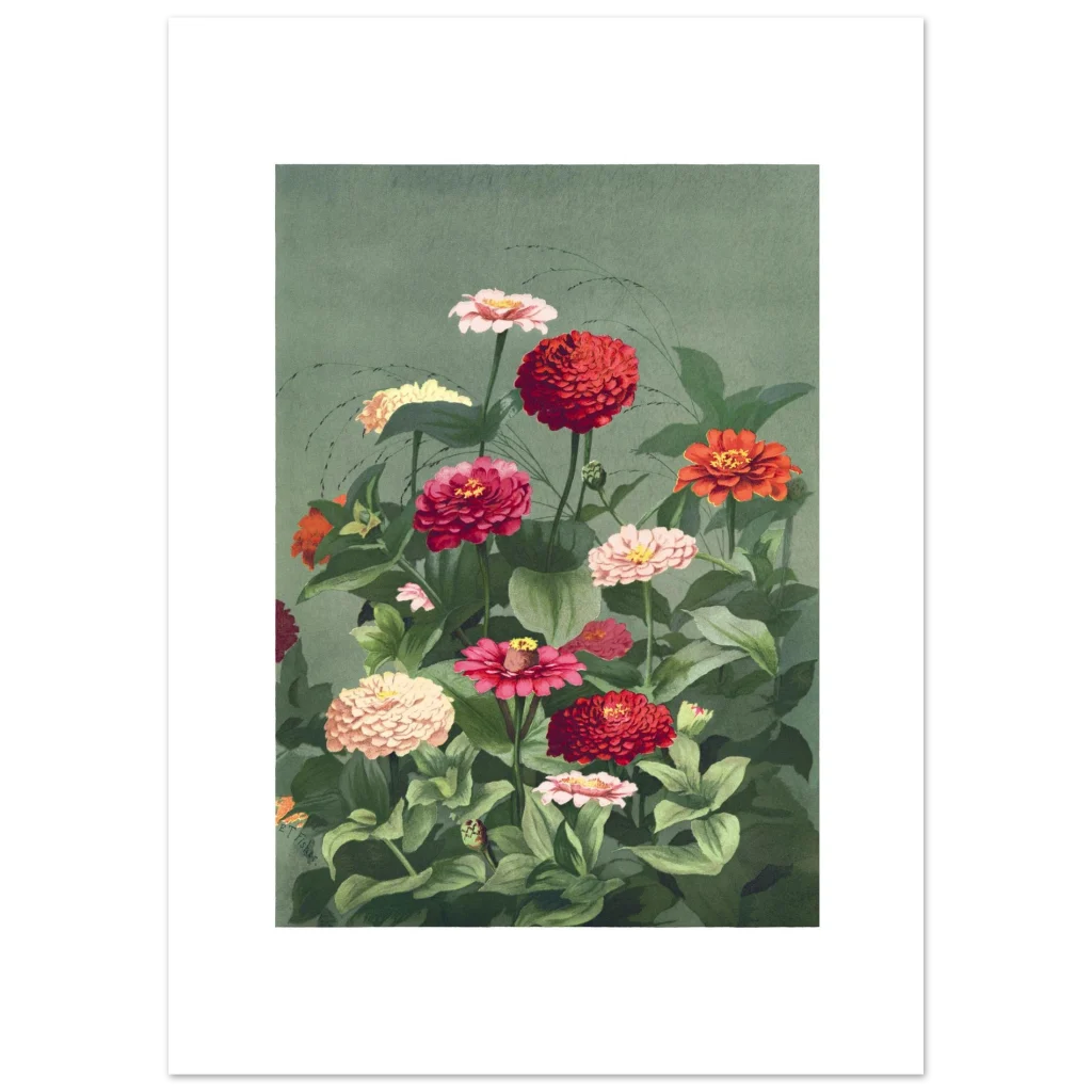 Bring the timeless beauty of a lush zinnia garden into your home with this exquisite botanical art print. Featuring a rich tapestry of red, pink, and cream zinnias against a calming sage green background, this vintage-inspired piece evokes a sense of tranquil elegance and natural vibrancy. Perfect for adding a touch of classic charm and a burst of color to any room, it’s a celebration of nature’s artistry.