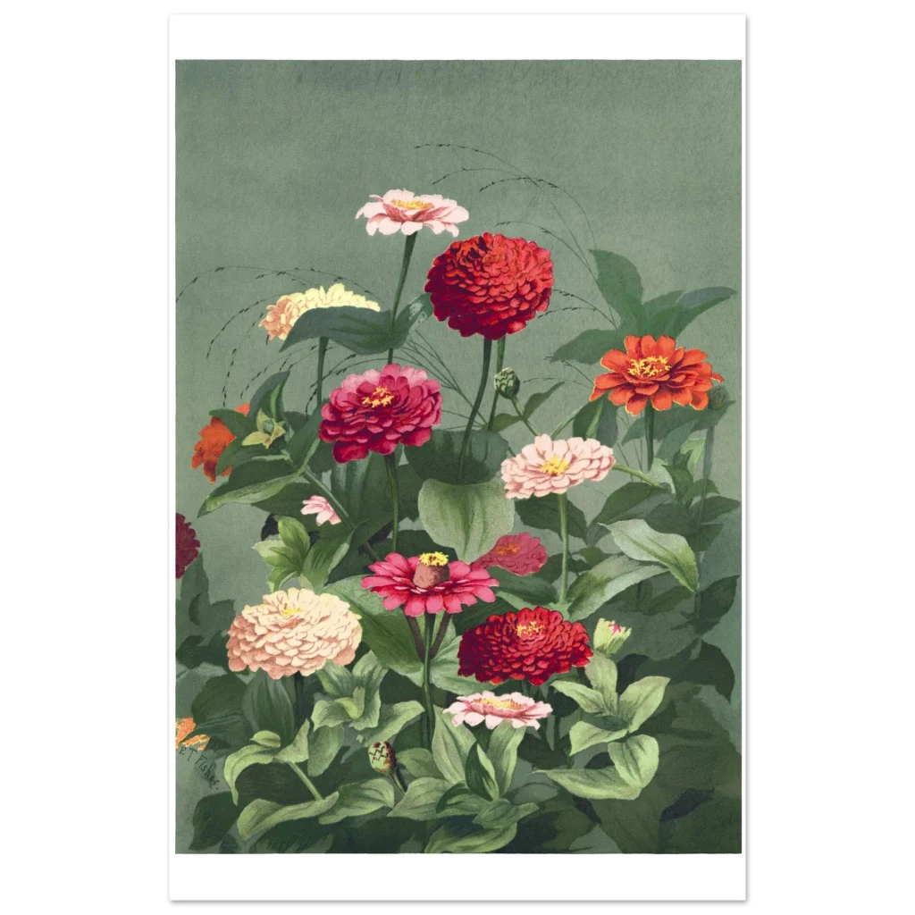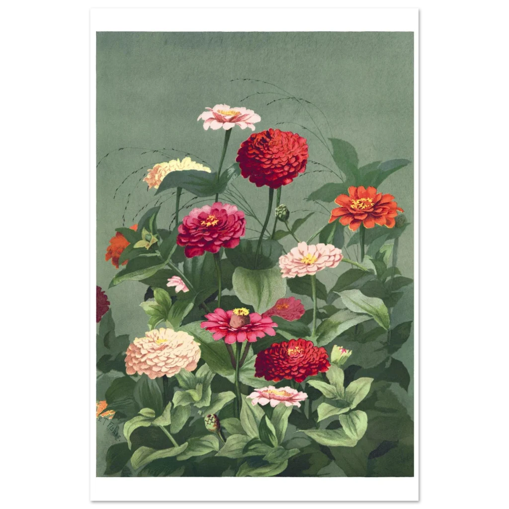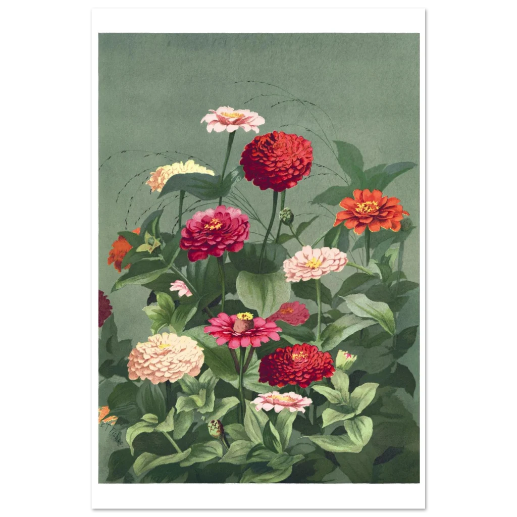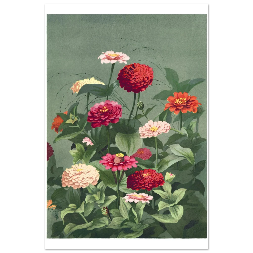 Bring the timeless beauty of a lush zinnia garden into your home with this exquisite botanical art print. Featuring a rich tapestry of red, pink, and cream zinnias against a calming sage green background, this vintage-inspired piece evokes a sense of tranquil elegance and natural vibrancy. Perfect for adding a touch of classic charm and a burst of color to any room, it’s a celebration of nature’s artistry.