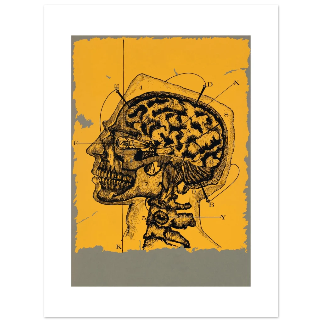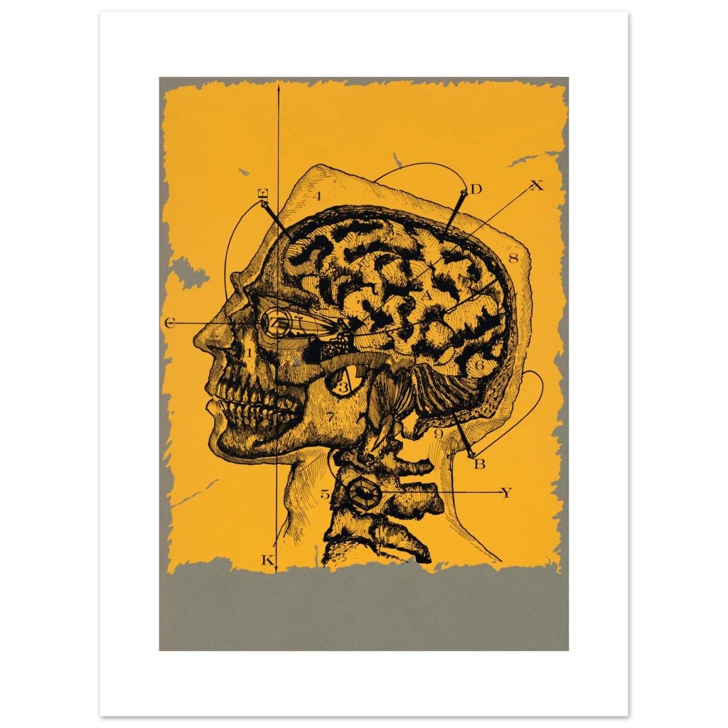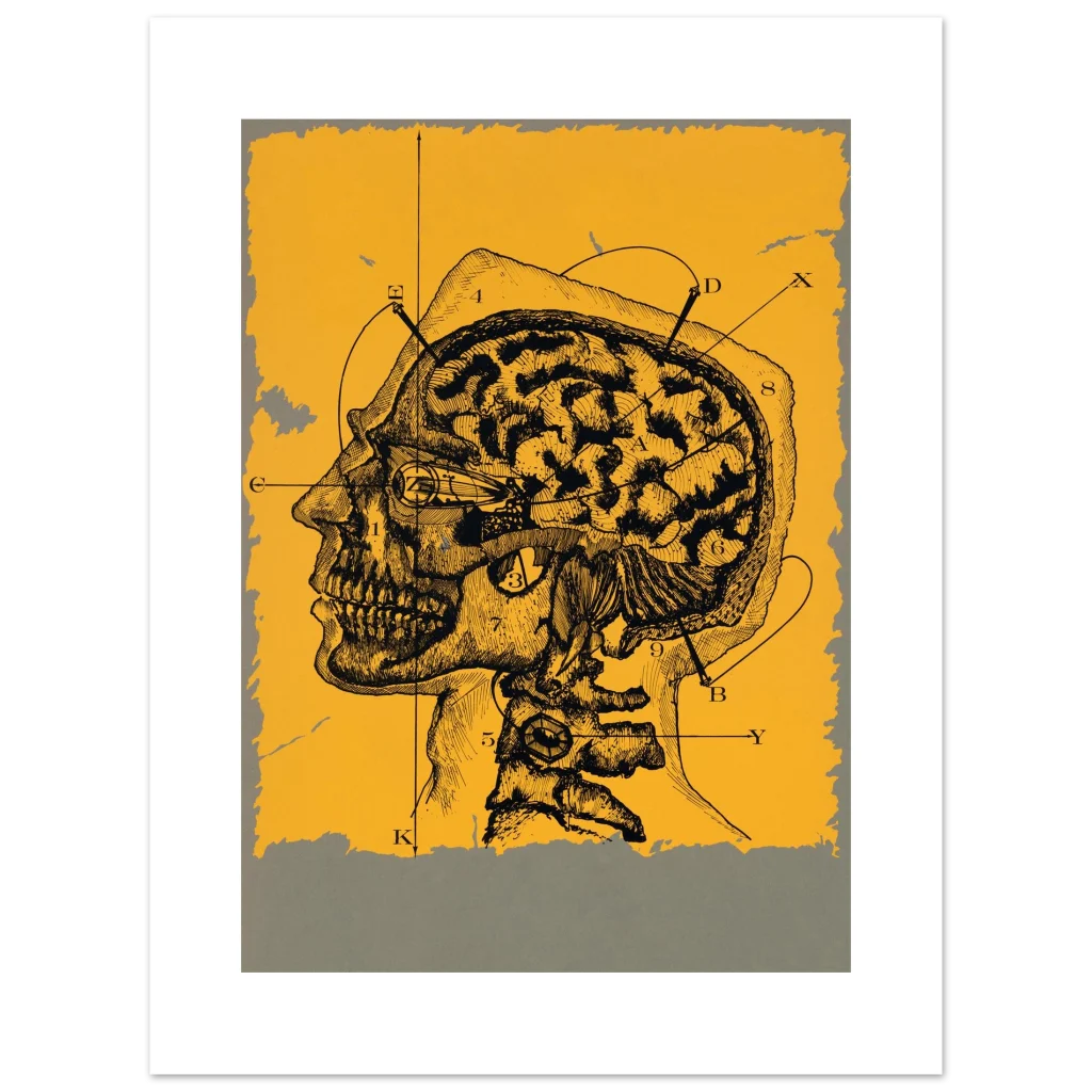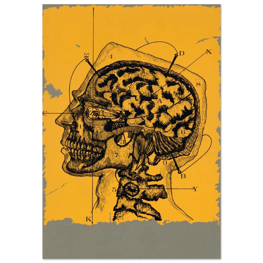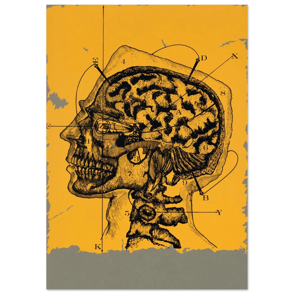 Unlock the mysteries of the mind with this captivating vintage anatomical brain and skull diagram poster. Set against a striking mustard yellow backdrop, the intricate black linework creates a bold contrast, making this piece a focal point for any room. Perfect for those who appreciate the intersection of science, history, and art, this print brings a touch of sophisticated curiosity to your home, office, or study space.
