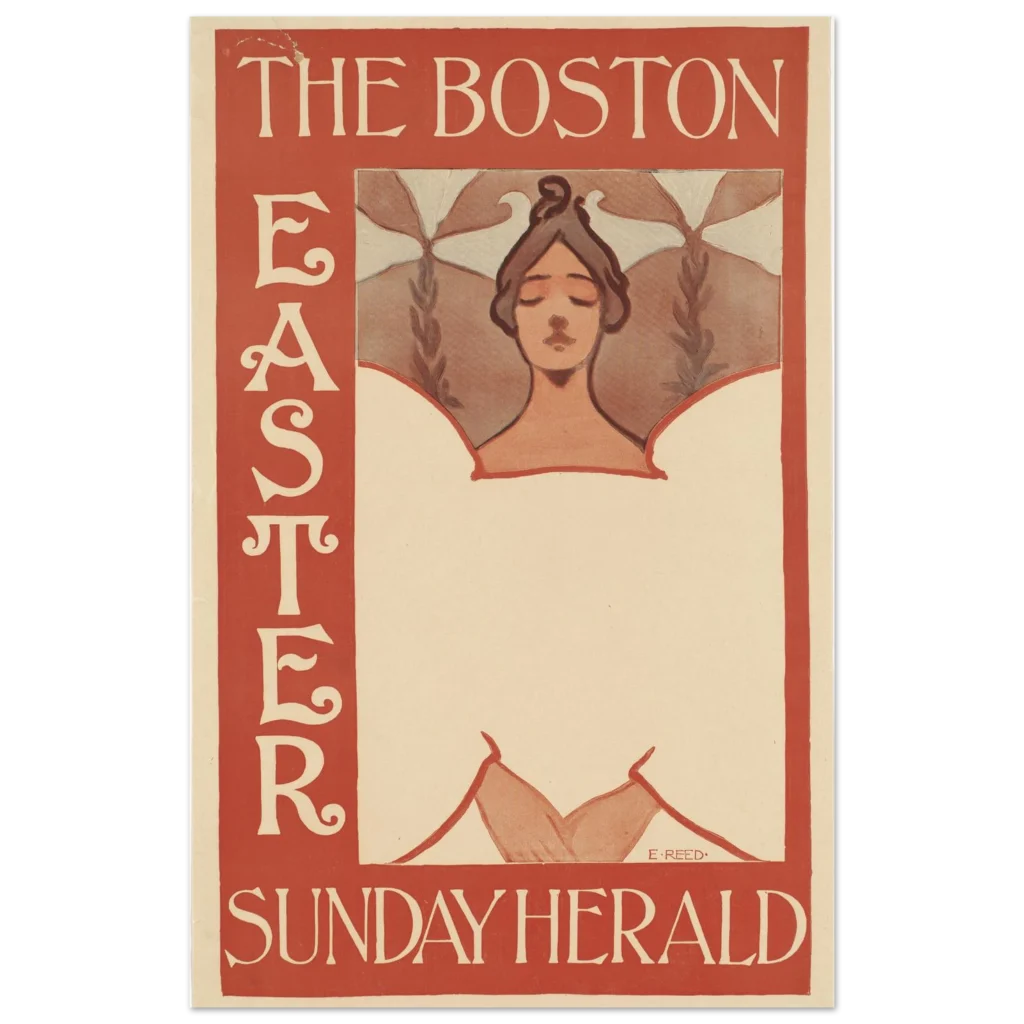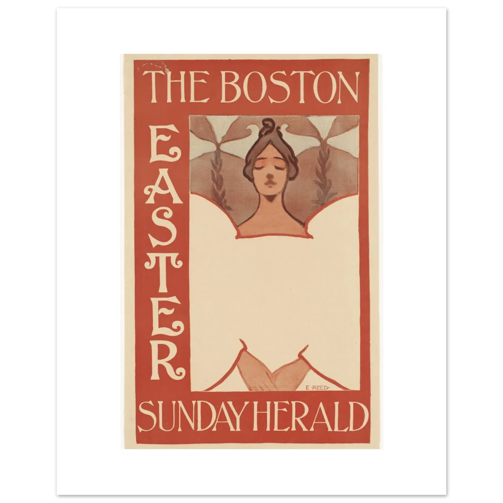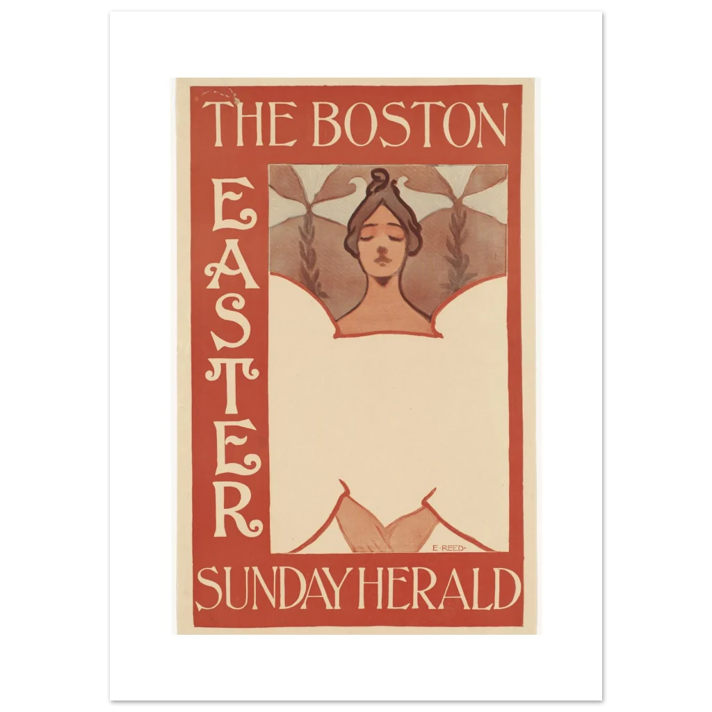 Step back in time with this exquisite reproduction of ‘The Boston Easter Sunday Herald’ poster, an iconic piece by E. Reed. This art nouveau masterpiece, with its serene figure and elegant typography set against a warm red and cream palette, brings a touch of historical charm and sophisticated artistry to any space. It’s more than just a poster; it’s a window to a bygone era, perfect for collectors and enthusiasts of vintage design.
