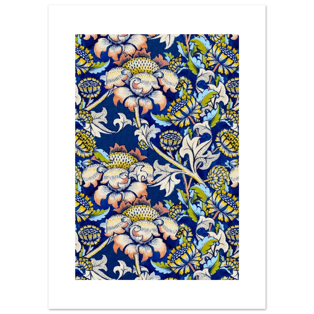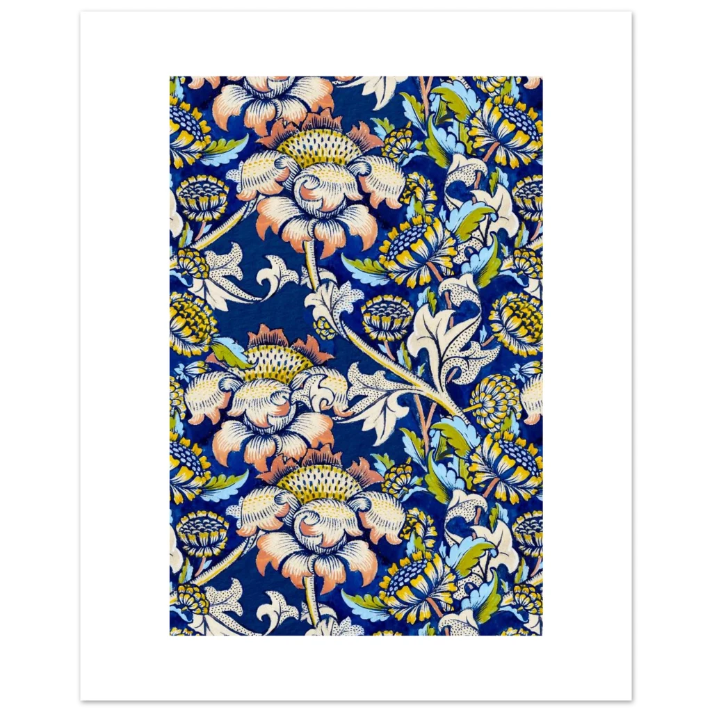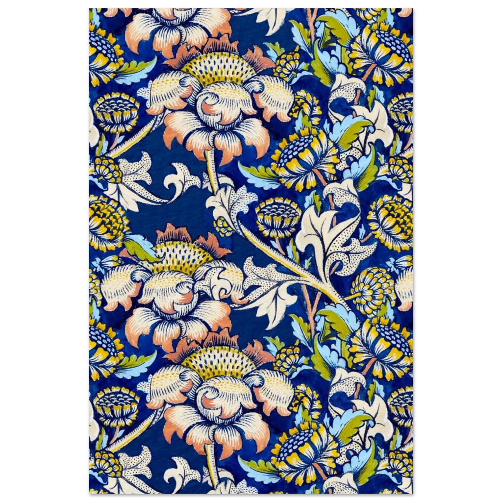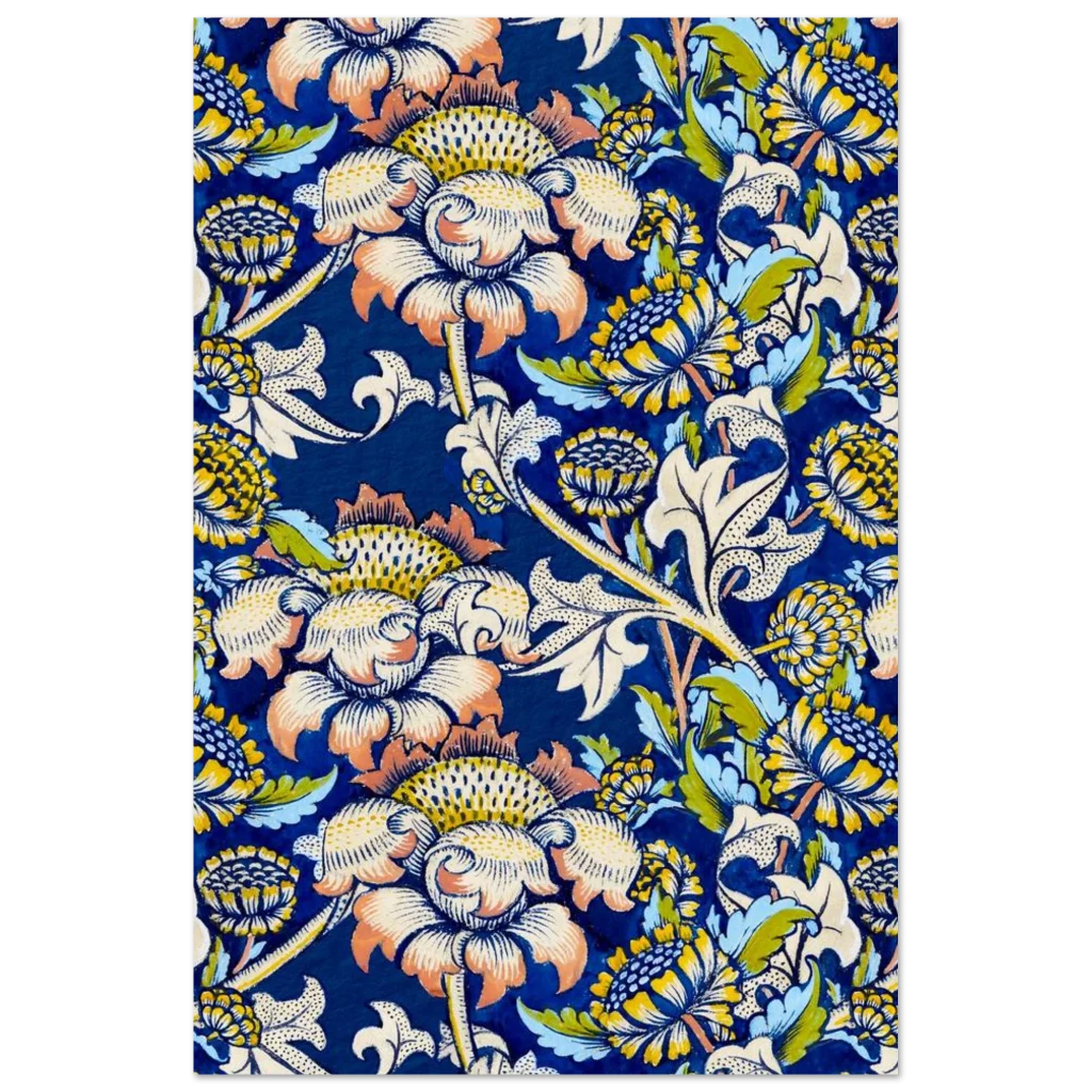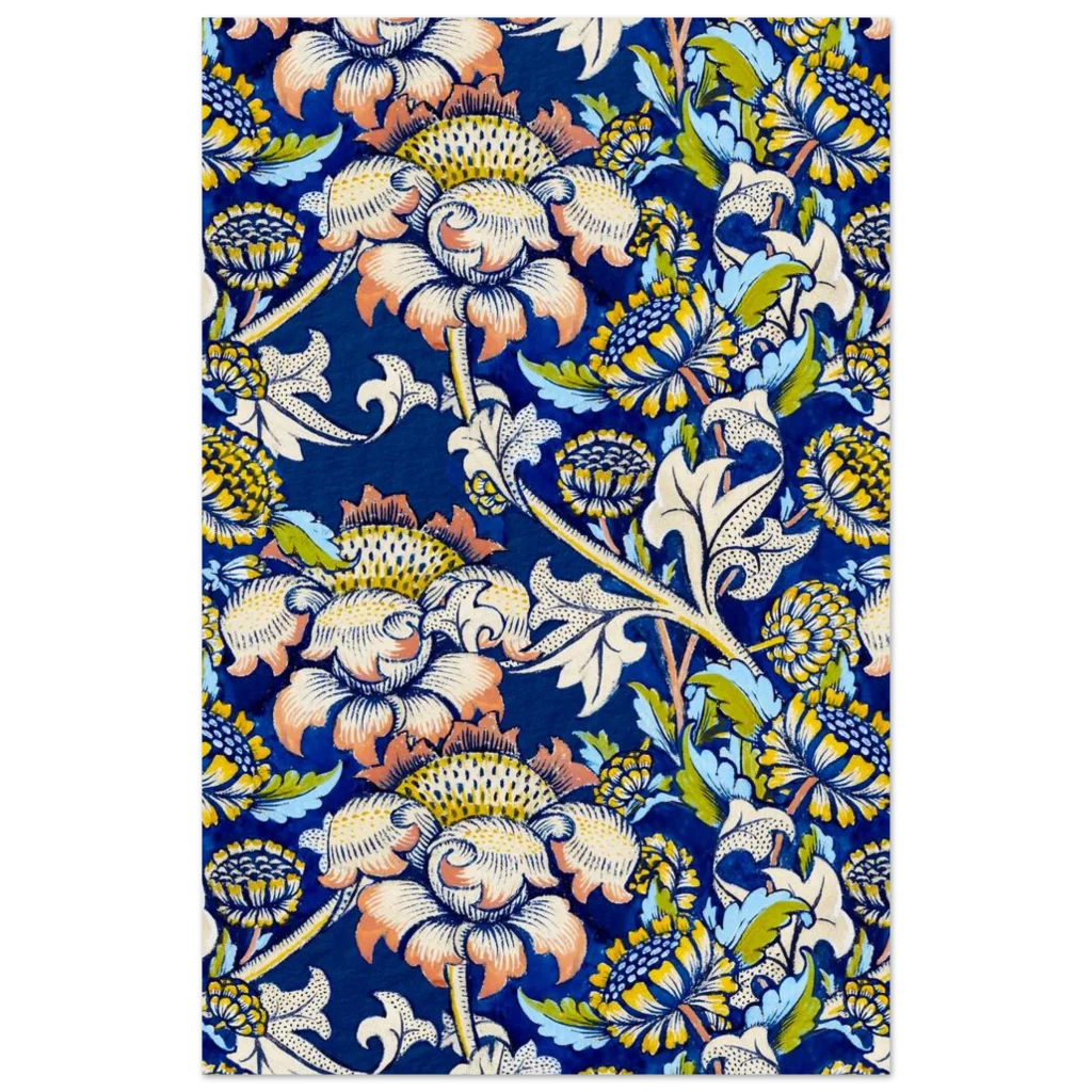 Infuse your living space with the timeless elegance of nature through our Vintage Botanical Floral Art Print. This exquisite pattern, reminiscent of classic Arts and Crafts designs, features a rich palette of deep blues, sunny yellows, soft creams, and hints of sage green and coral. Each bloom and leaf is rendered with intricate detail, creating a lush, organic tapestry that brings a sense of serene sophistication to any room.