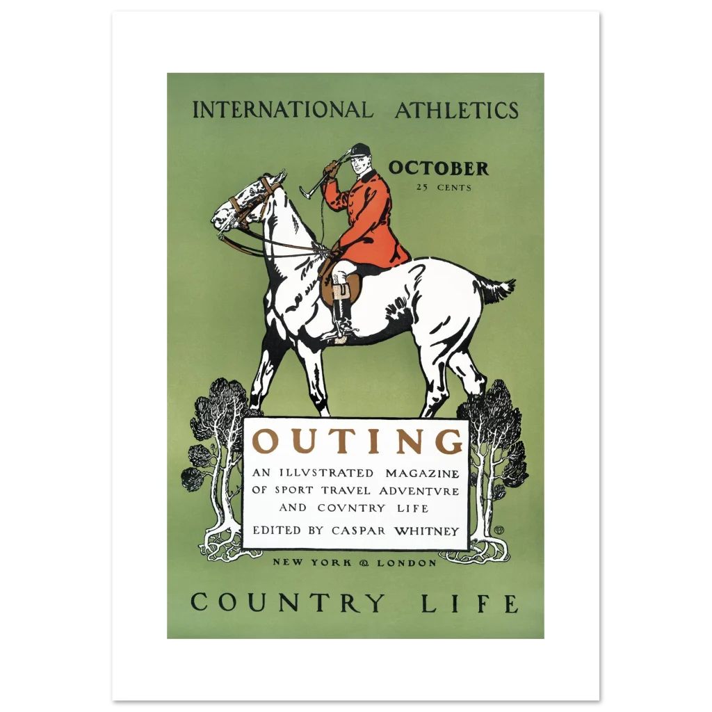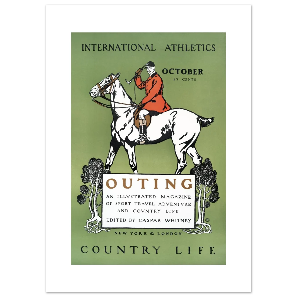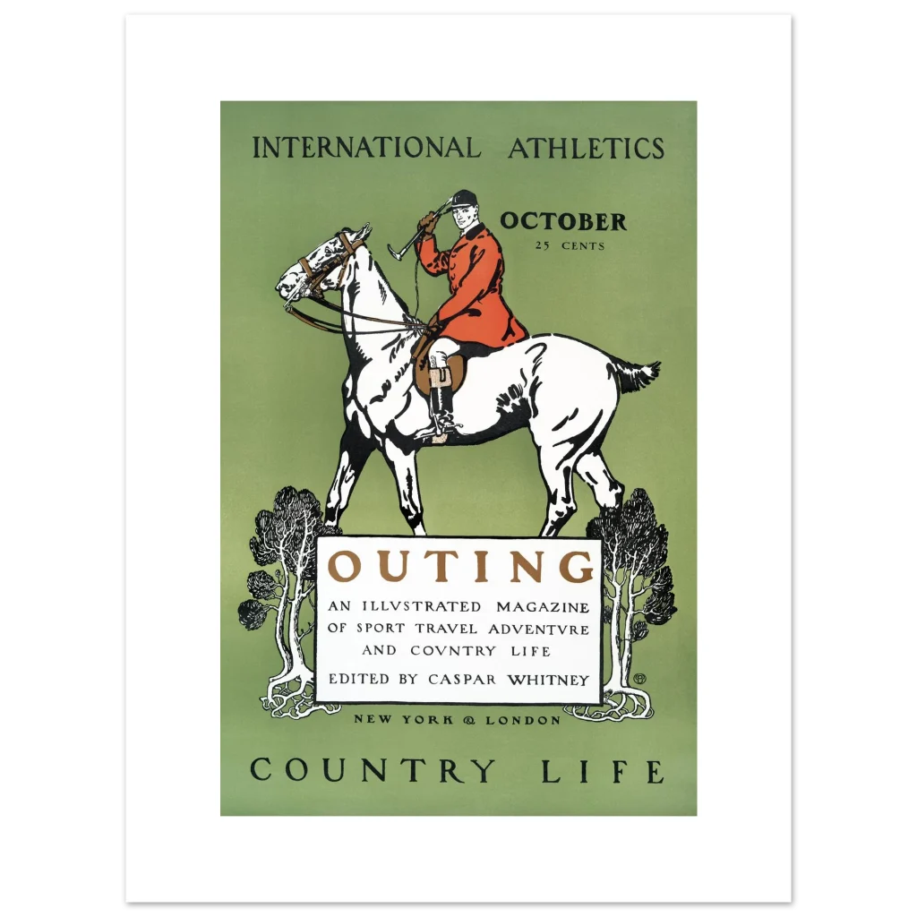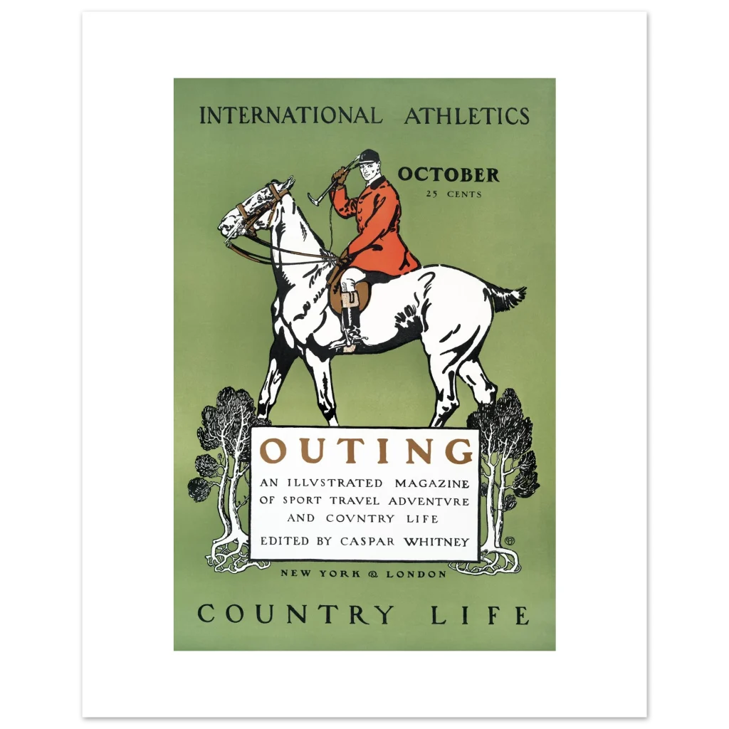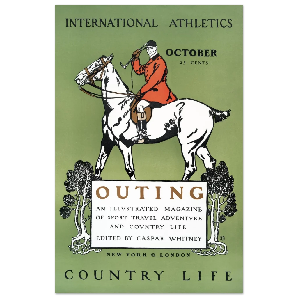 Capture the timeless elegance of a bygone era with this exquisite poster, reminiscent of classic “Outing” magazine covers. Featuring a distinguished rider atop a magnificent white horse against a verdant green backdrop, this artwork evokes the spirit of international athletics and country life. It’s a perfect blend of vintage charm and sophisticated sport, designed to add a touch of aristocratic flair to any room.
