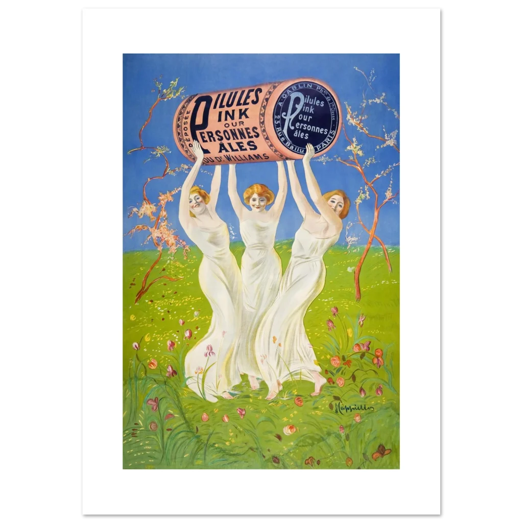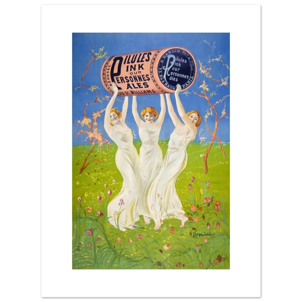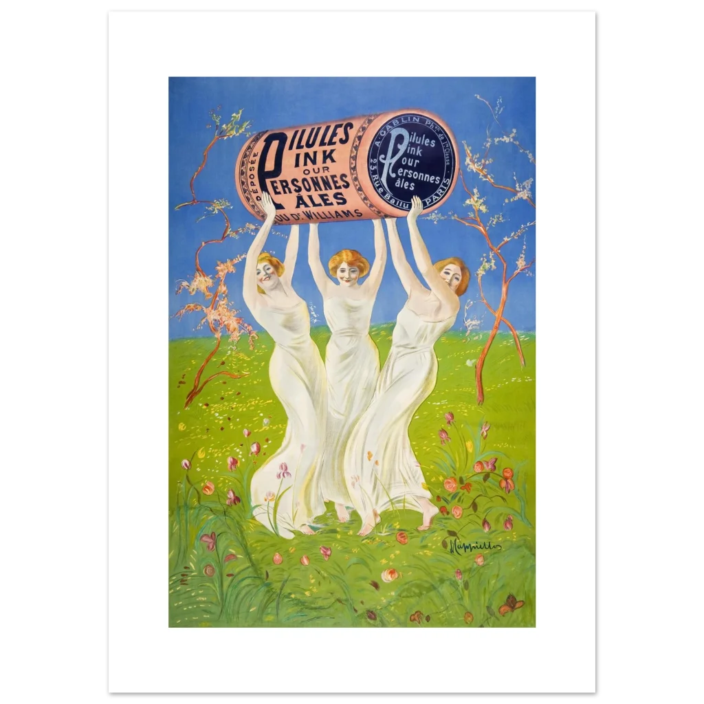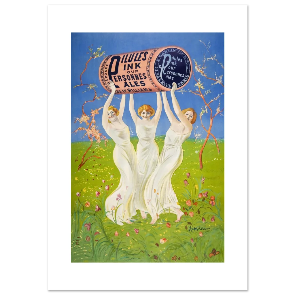 Step back into the enchanting world of early 20th-century advertising with this captivating ‘Pilules Pink’ poster by the master of Art Nouveau, Leonetto Cappiello. This vibrant piece, featuring three graceful figures holding a monumental pink cylinder against a lush green and sky-blue backdrop, exudes joy and whimsy, perfect for adding a touch of classic elegance and historical charm to any room. Its cheerful palette and iconic design make it a standout for art lovers and collectors alike.