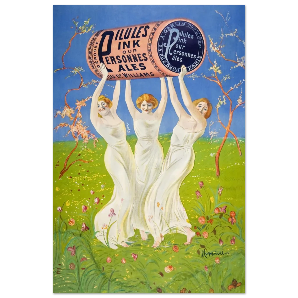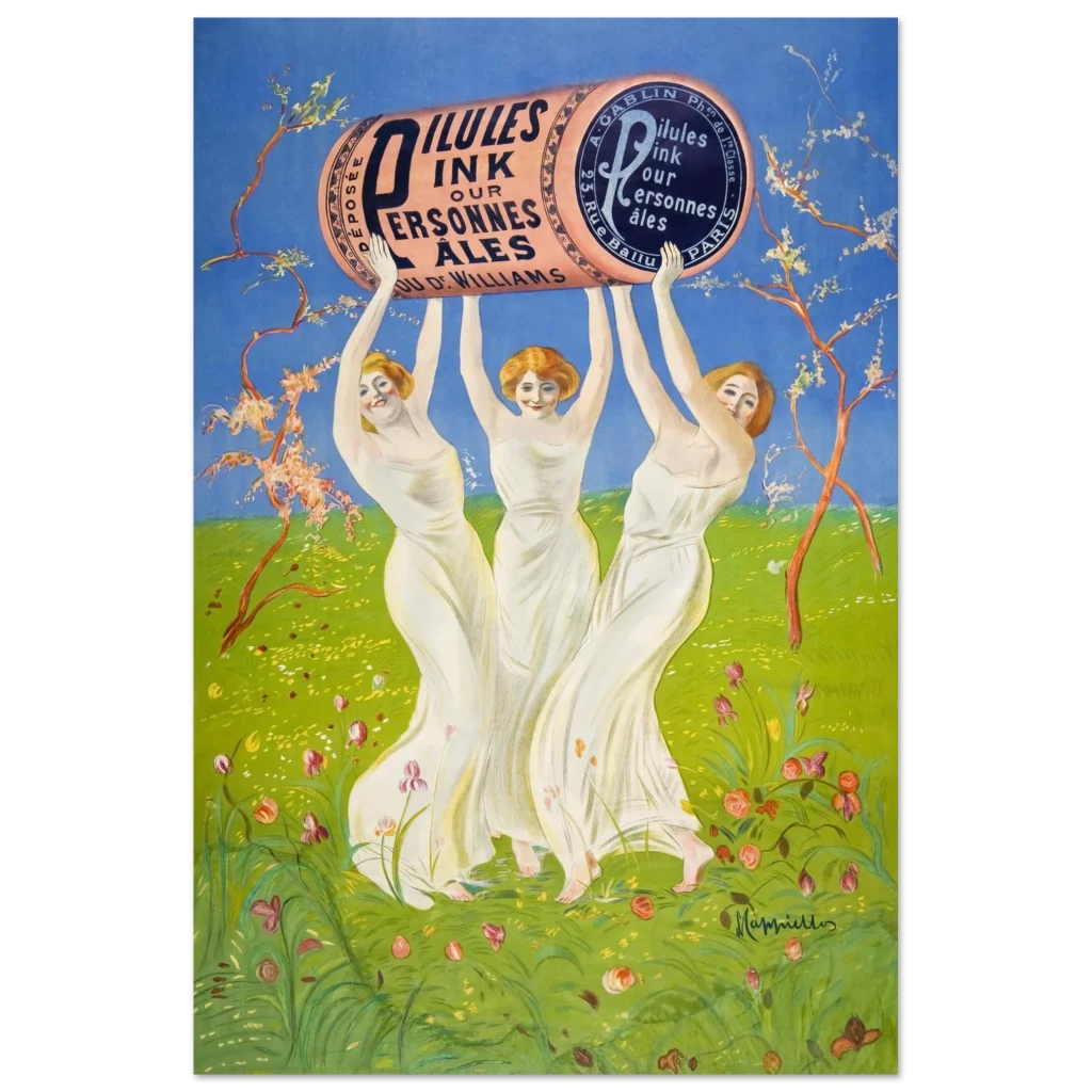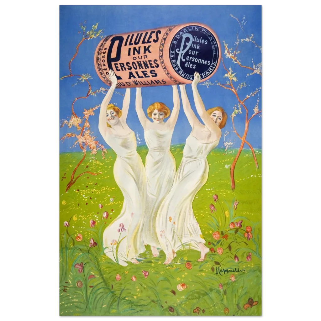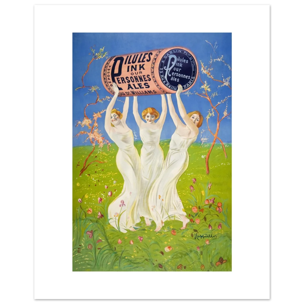 Step back into the enchanting world of early 20th-century advertising with this captivating ‘Pilules Pink’ poster by the master of Art Nouveau, Leonetto Cappiello. This vibrant piece, featuring three graceful figures holding a monumental pink cylinder against a lush green and sky-blue backdrop, exudes joy and whimsy, perfect for adding a touch of classic elegance and historical charm to any room. Its cheerful palette and iconic design make it a standout for art lovers and collectors alike.