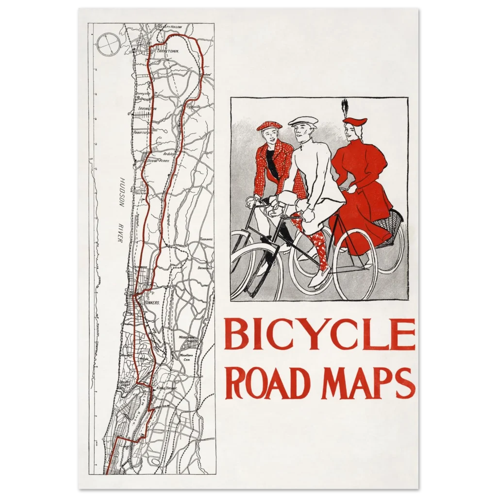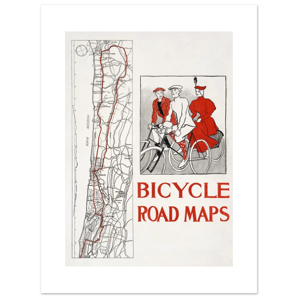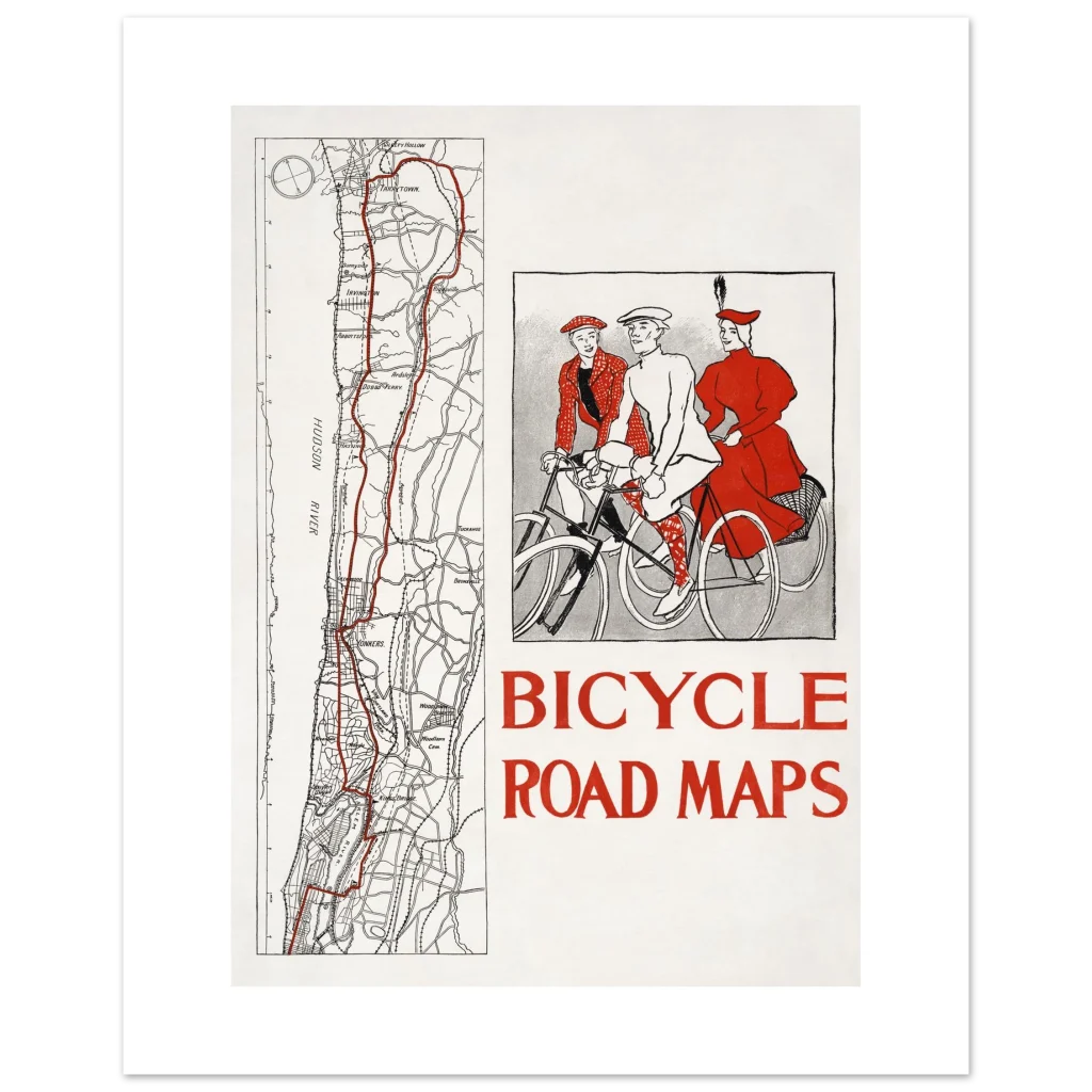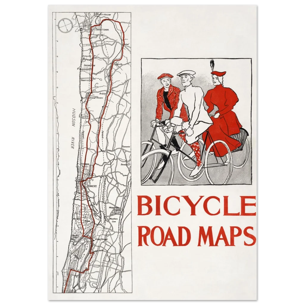 Embark on a nostalgic journey with our ‘Bicycle Road Maps’ poster, capturing the spirit of turn-of-the-century cycling adventures along the historic Hudson River. This charming print, featuring stylish cyclists in vibrant red attire and a detailed route map, brings a touch of classic exploration and timeless elegance to any space.