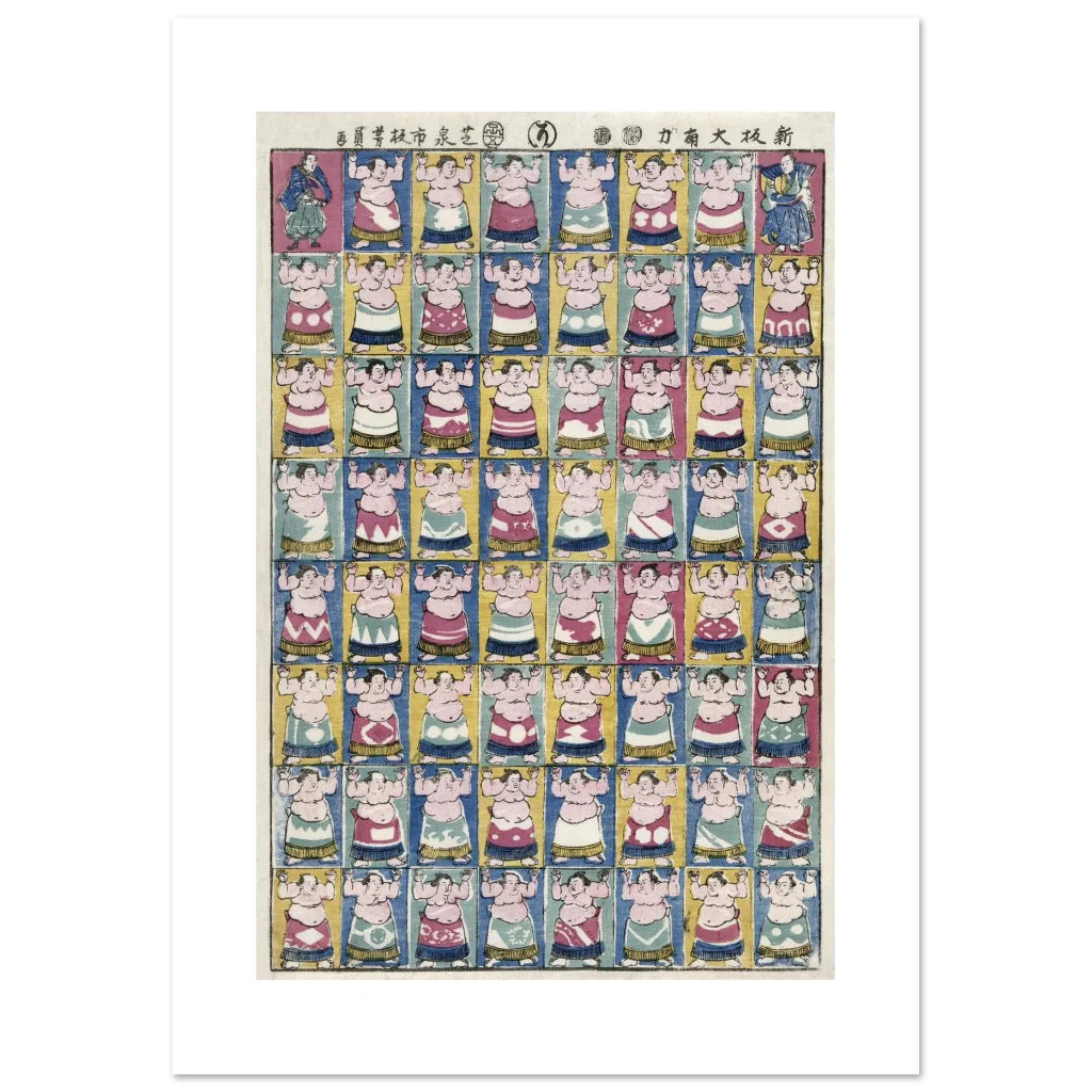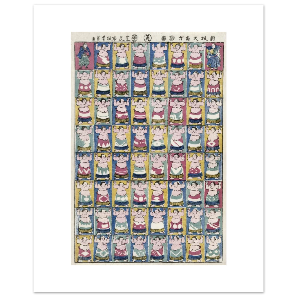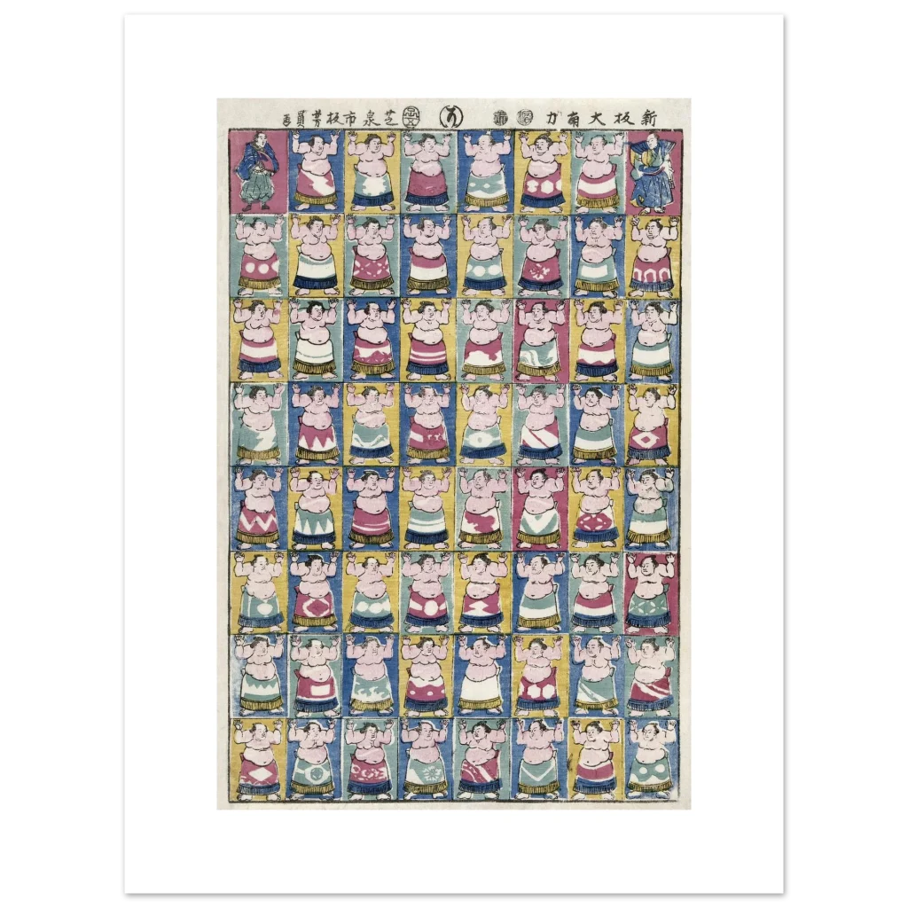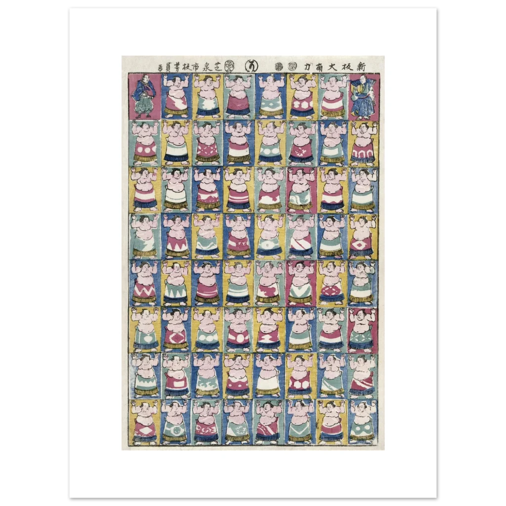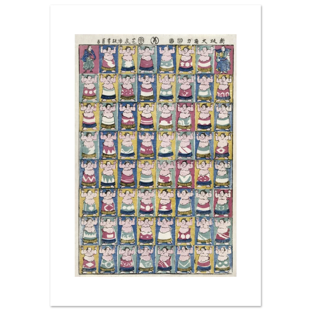 Step into the rich history of Japanese culture with our vibrant Ukiyo-e inspired premium matte paper poster. This exquisite piece captures the playful spirit and dynamic energy of traditional sumo wrestlers, rendered in a charming Edo-era artistic style. With its distinctive color palette of blues, pinks, yellows, and white, this print brings a touch of vintage elegance and cultural depth to any space.