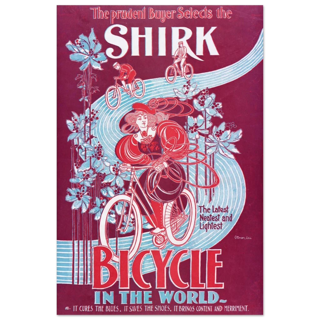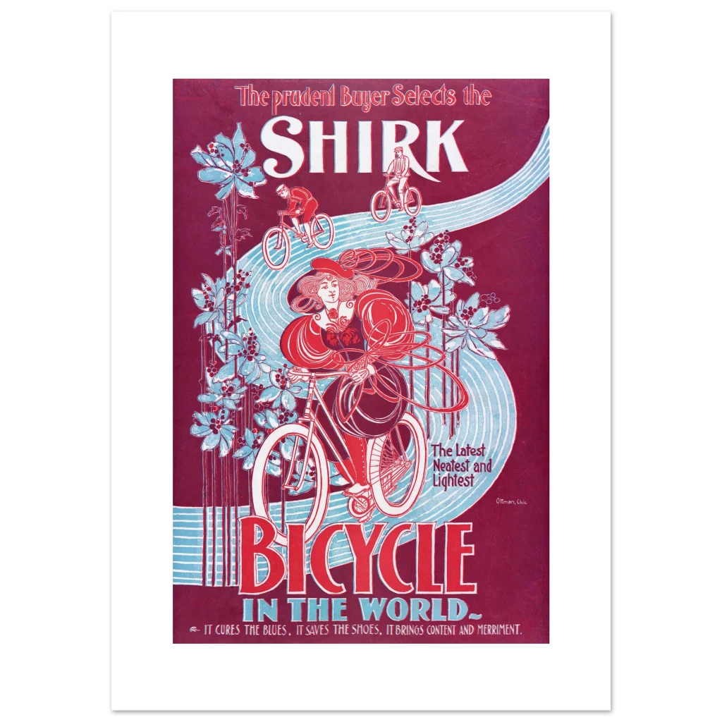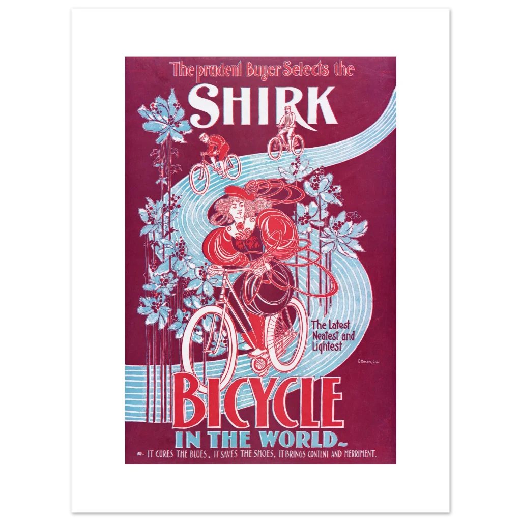 Step back in time with our captivating “Shirk Bicycle” poster, a stunning reproduction of a classic Art Nouveau advertisement. Featuring a striking palette of deep burgundy, vibrant red, and serene sky blue, this piece evokes the elegance and freedom of early cycling. It’s more than just a poster; it’s a statement of timeless style and a nod to the golden age of design, perfect for adding a touch of vintage charm to any room.