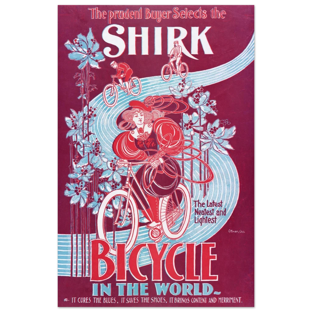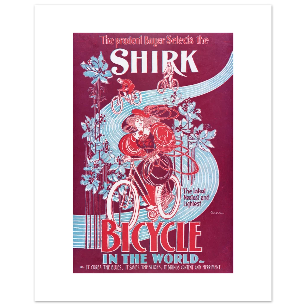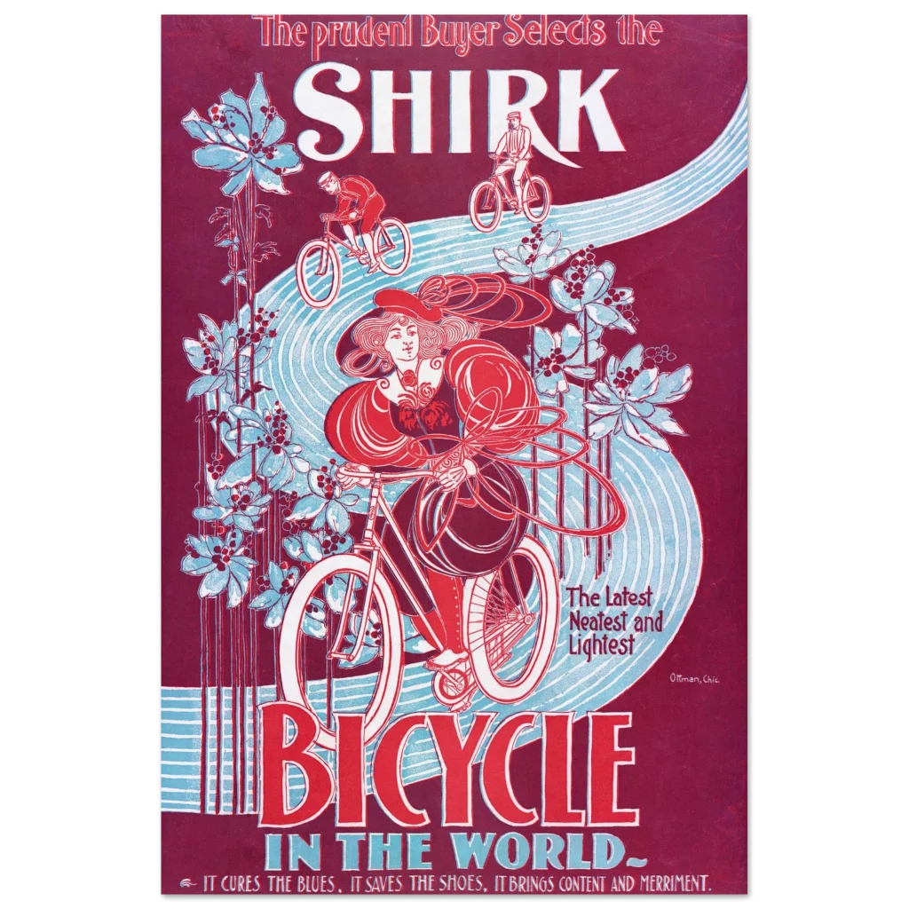 Step back in time with our captivating “Shirk Bicycle” poster, a stunning reproduction of a classic Art Nouveau advertisement. Featuring a striking palette of deep burgundy, vibrant red, and serene sky blue, this piece evokes the elegance and freedom of early cycling. It’s more than just a poster; it’s a statement of timeless style and a nod to the golden age of design, perfect for adding a touch of vintage charm to any room.