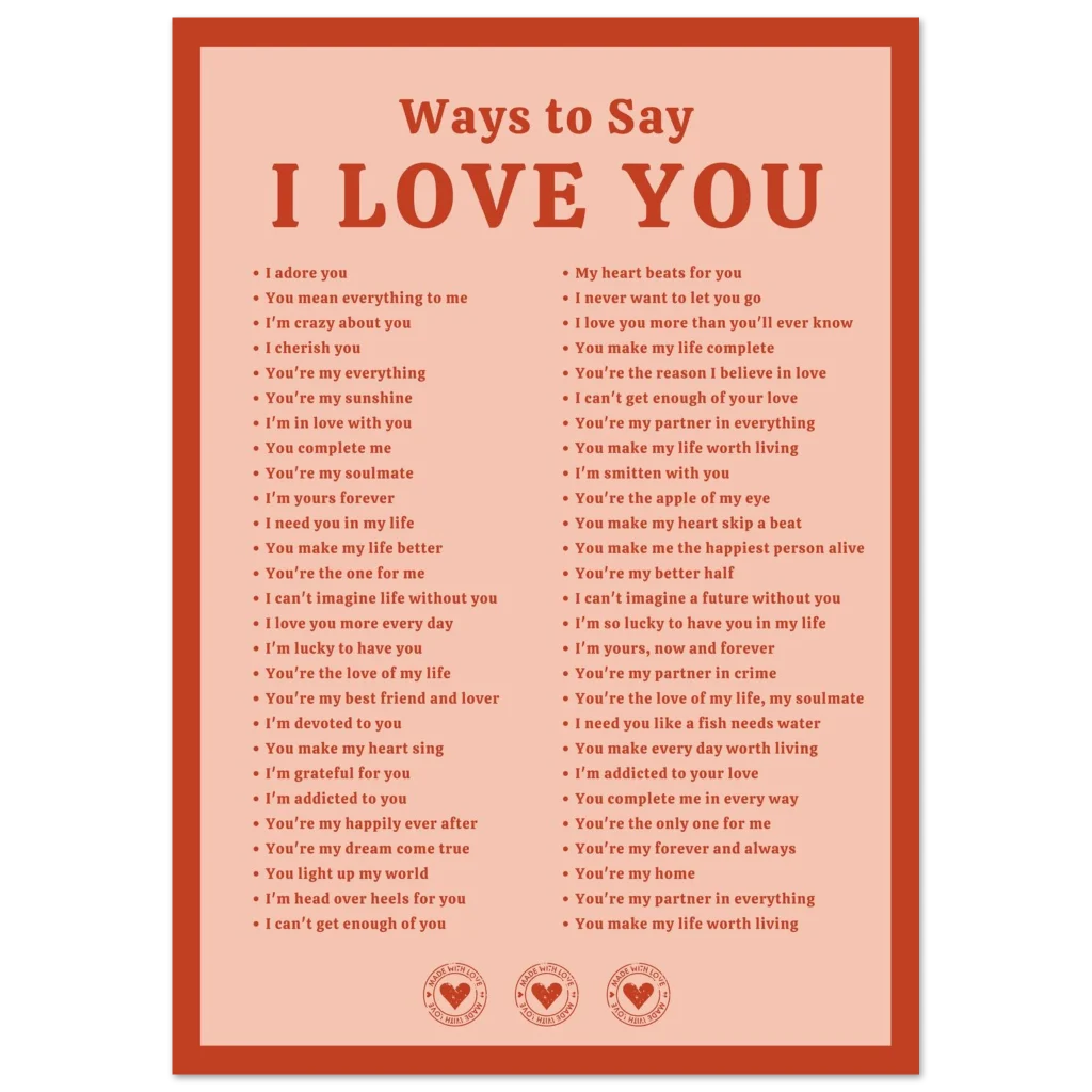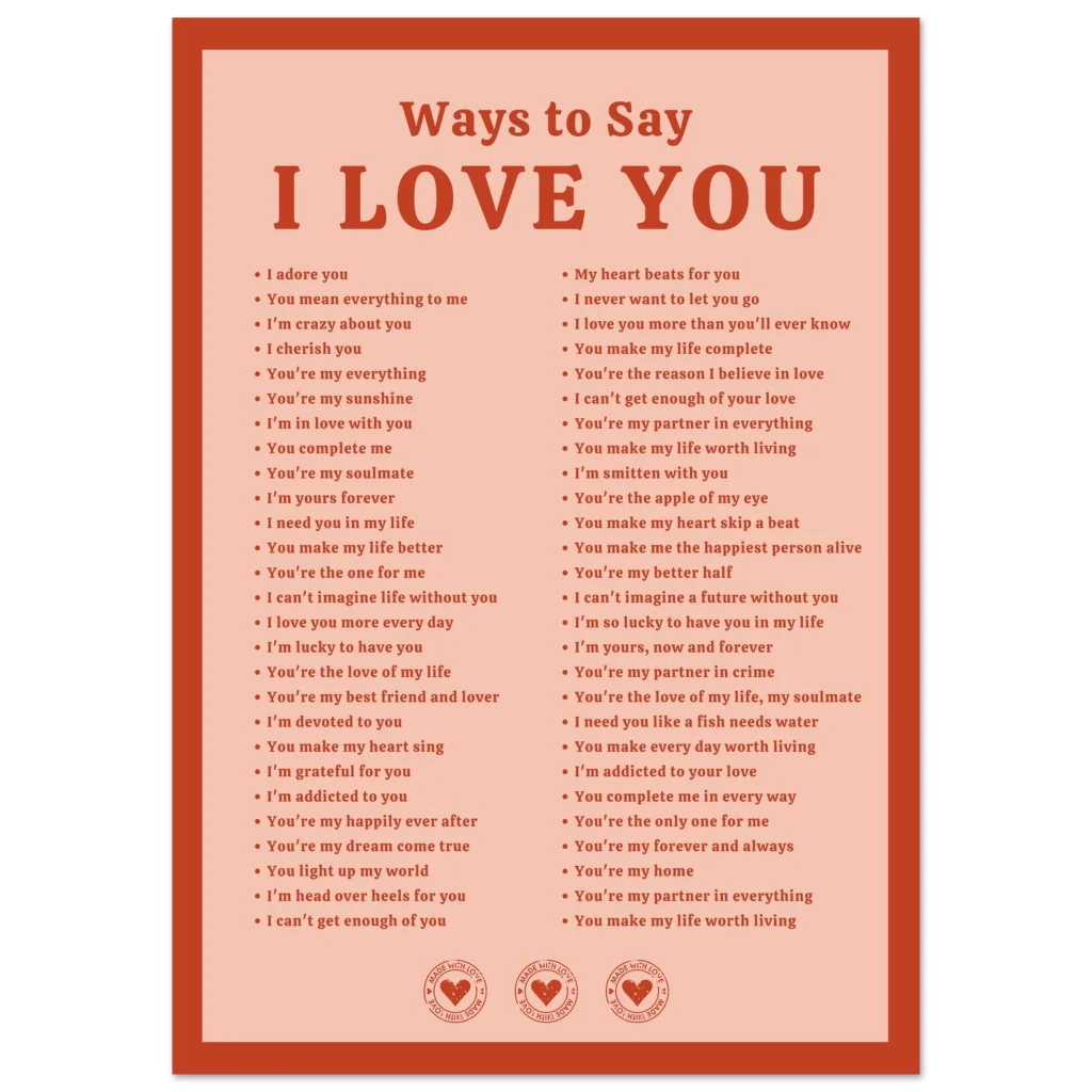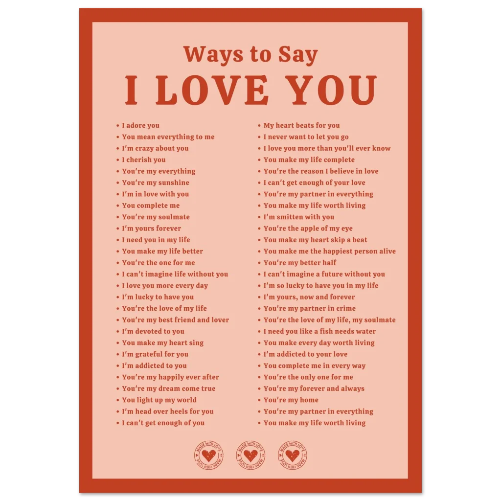 Express your affection in countless ways with our “Ways to Say I Love You” poster, a heartfelt ode to love featuring charming coral text against a warm peach background. This romantic piece is perfect for adding a touch of warmth and sincerity to any room, serving as a daily reminder of love’s beautiful expressions. It’s an ideal gift for anniversaries, Valentine’s Day, or just to show someone special how much they mean to you.