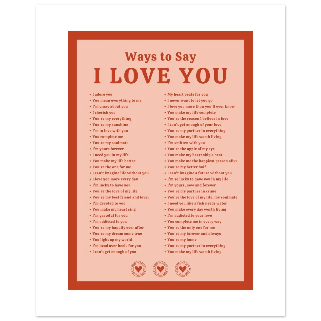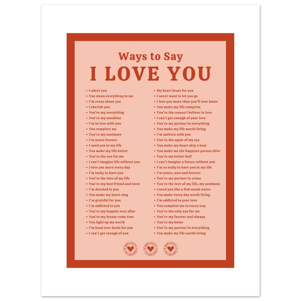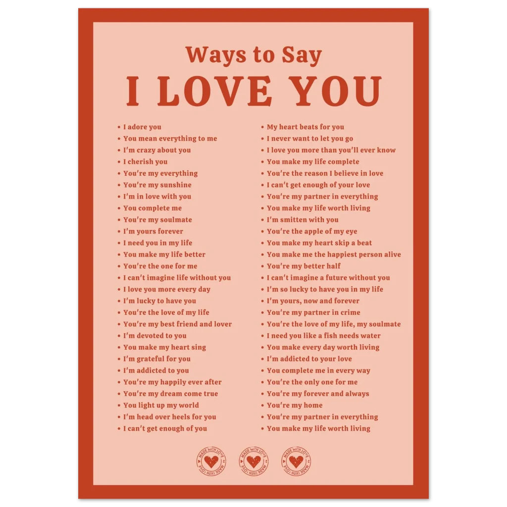 Express your affection in countless ways with our “Ways to Say I Love You” poster, a heartfelt ode to love featuring charming coral text against a warm peach background. This romantic piece is perfect for adding a touch of warmth and sincerity to any room, serving as a daily reminder of love’s beautiful expressions. It’s an ideal gift for anniversaries, Valentine’s Day, or just to show someone special how much they mean to you.