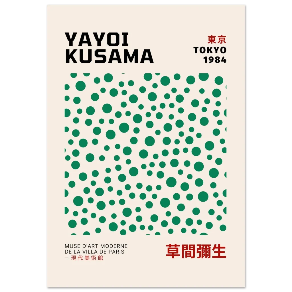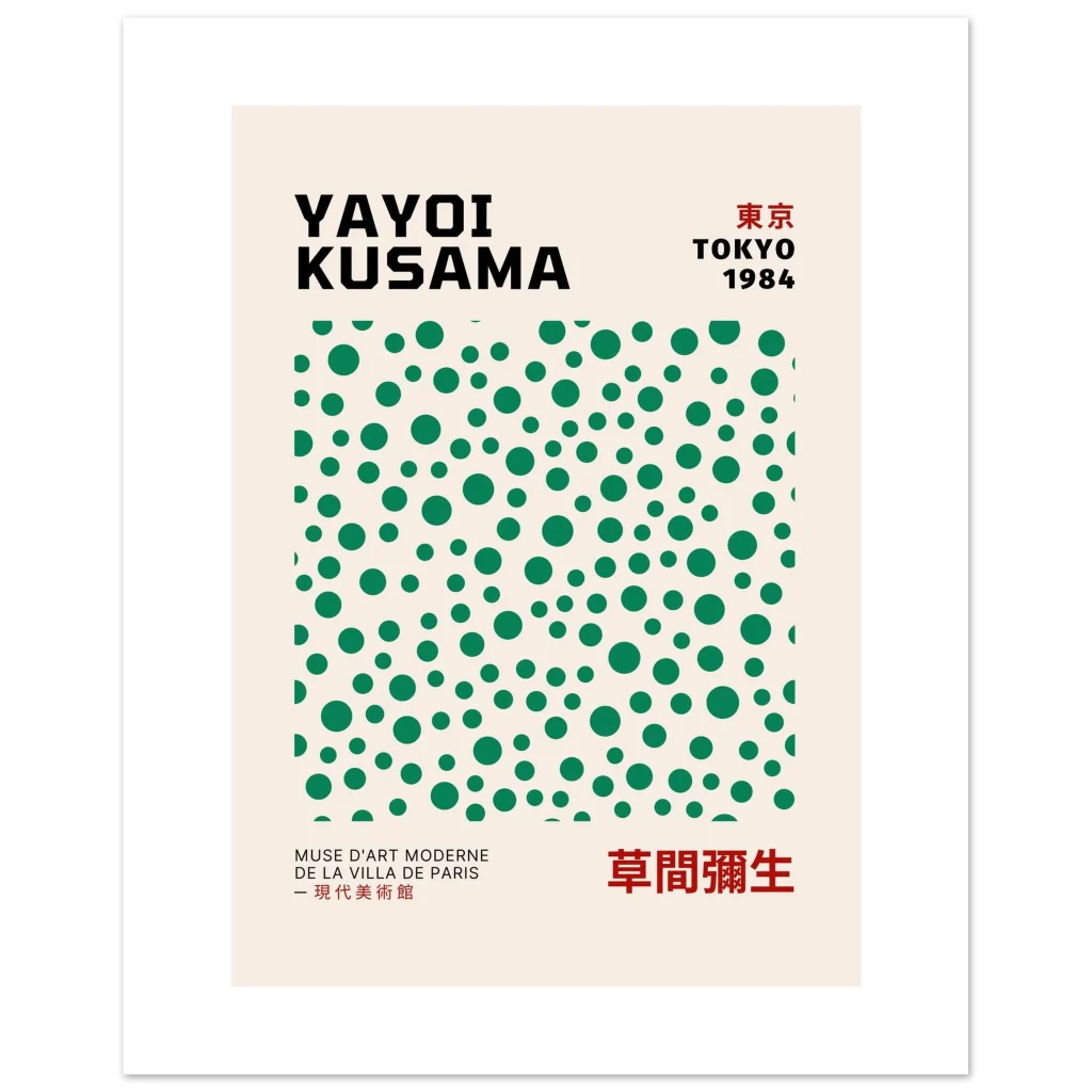 Immerse yourself in the iconic world of Yayoi Kusama with this vibrant poster, capturing the essence of her groundbreaking Tokyo exhibition in 1984. The playful yet profound green polka dots against a creamy backdrop offer a minimalist elegance that brightens any room, making it a perfect statement piece for art enthusiasts and modern decor lovers alike.