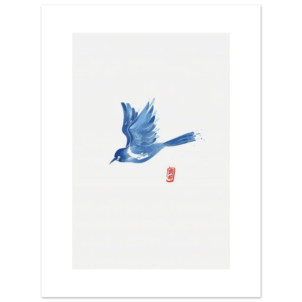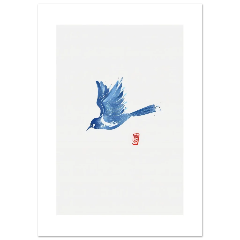 Invite tranquility and a touch of serene artistry into your home with our Zen Blue Bird poster. Featuring a captivating ink wash style, this artwork depicts a graceful blue bird in flight, embodying freedom and peaceful movement. The subtle textures and clean lines, accented by a traditional red seal, make it a perfect addition for those who appreciate minimalist elegance and a calm aesthetic.