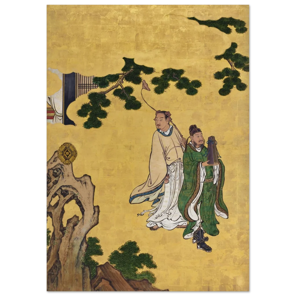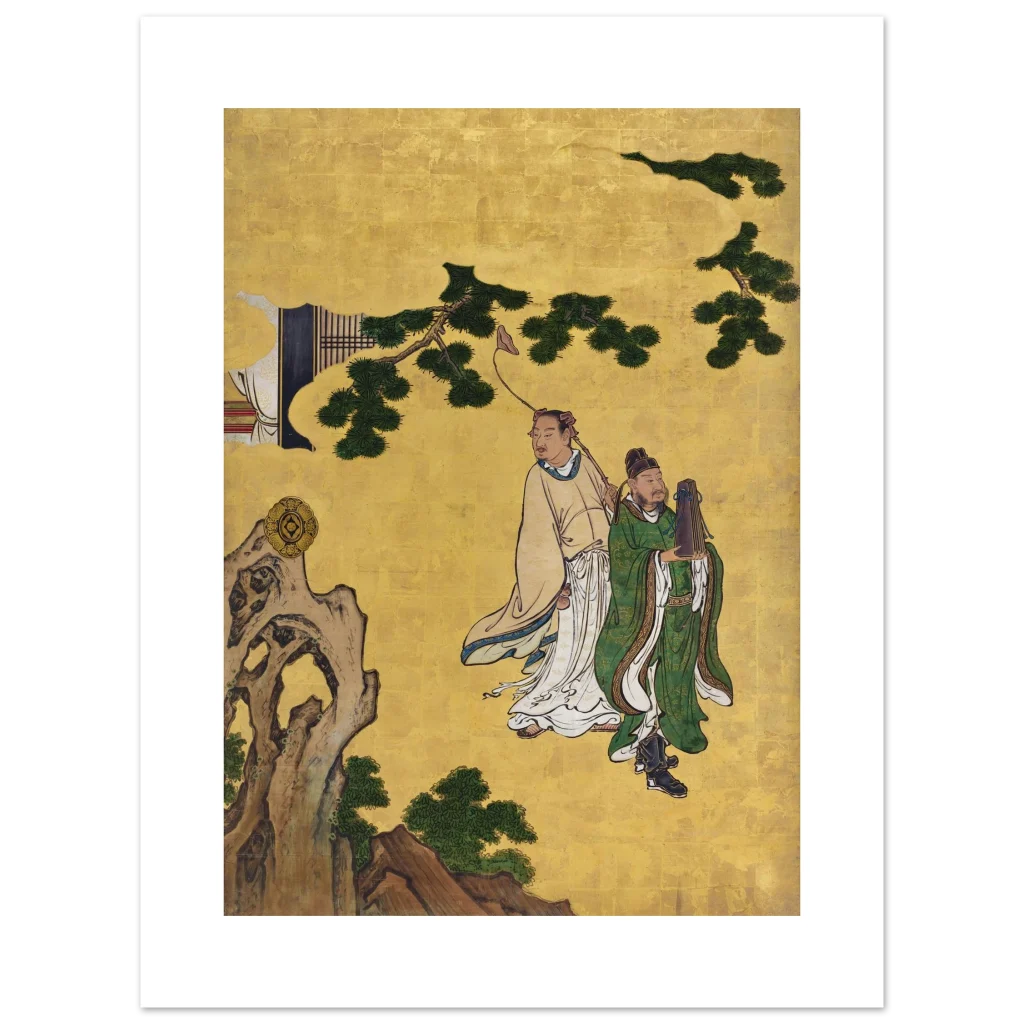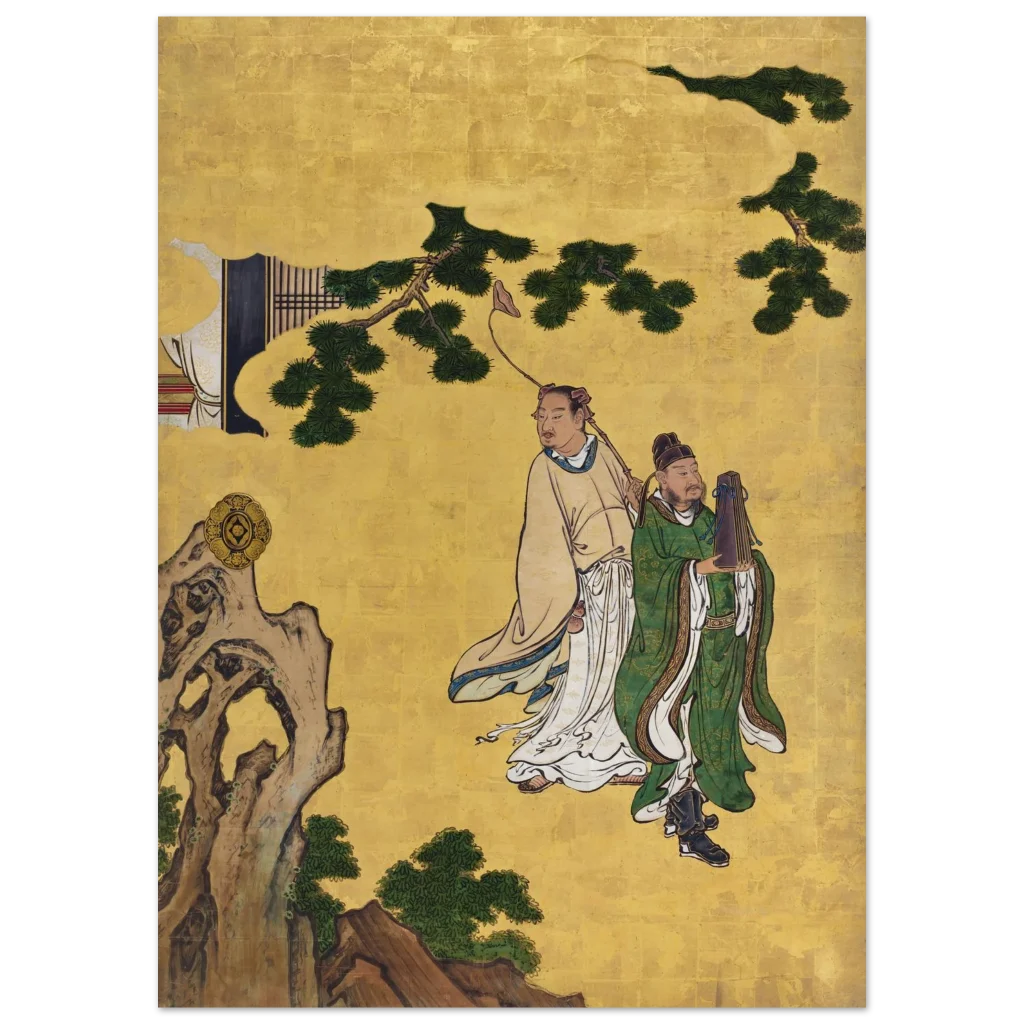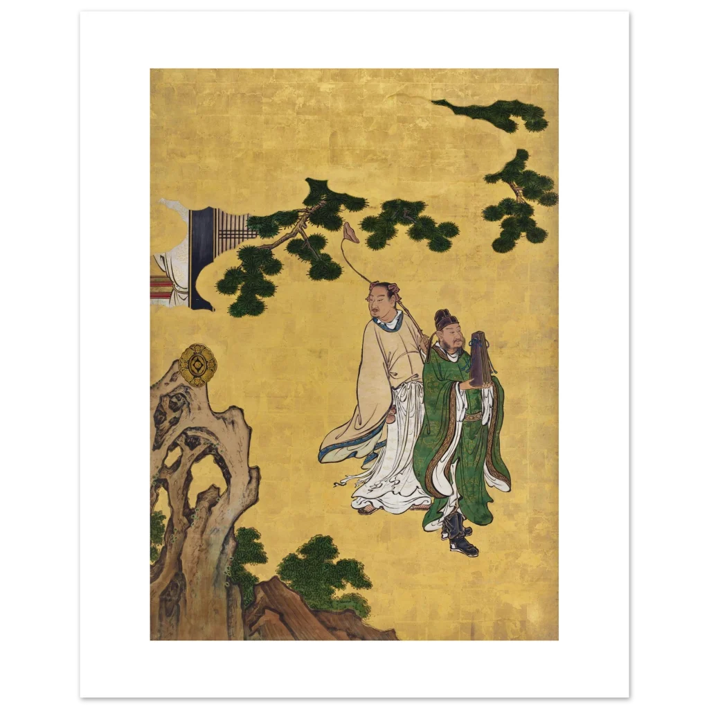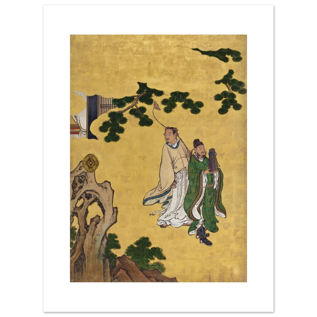 Immerse yourself in the serene elegance of ancient Eastern artistry with our ‘Zen Gold & Emerald Serenity’ poster. Featuring two distinguished figures amidst lush emerald foliage and a radiant gold backdrop, this piece brings a sense of tranquil wisdom and rich cultural heritage to any space. The intricate details and vibrant color palette are beautifully preserved, inviting contemplation and adding a touch of timeless sophistication to your home or office.