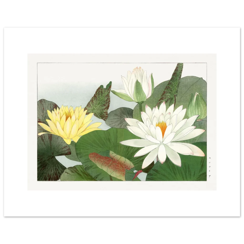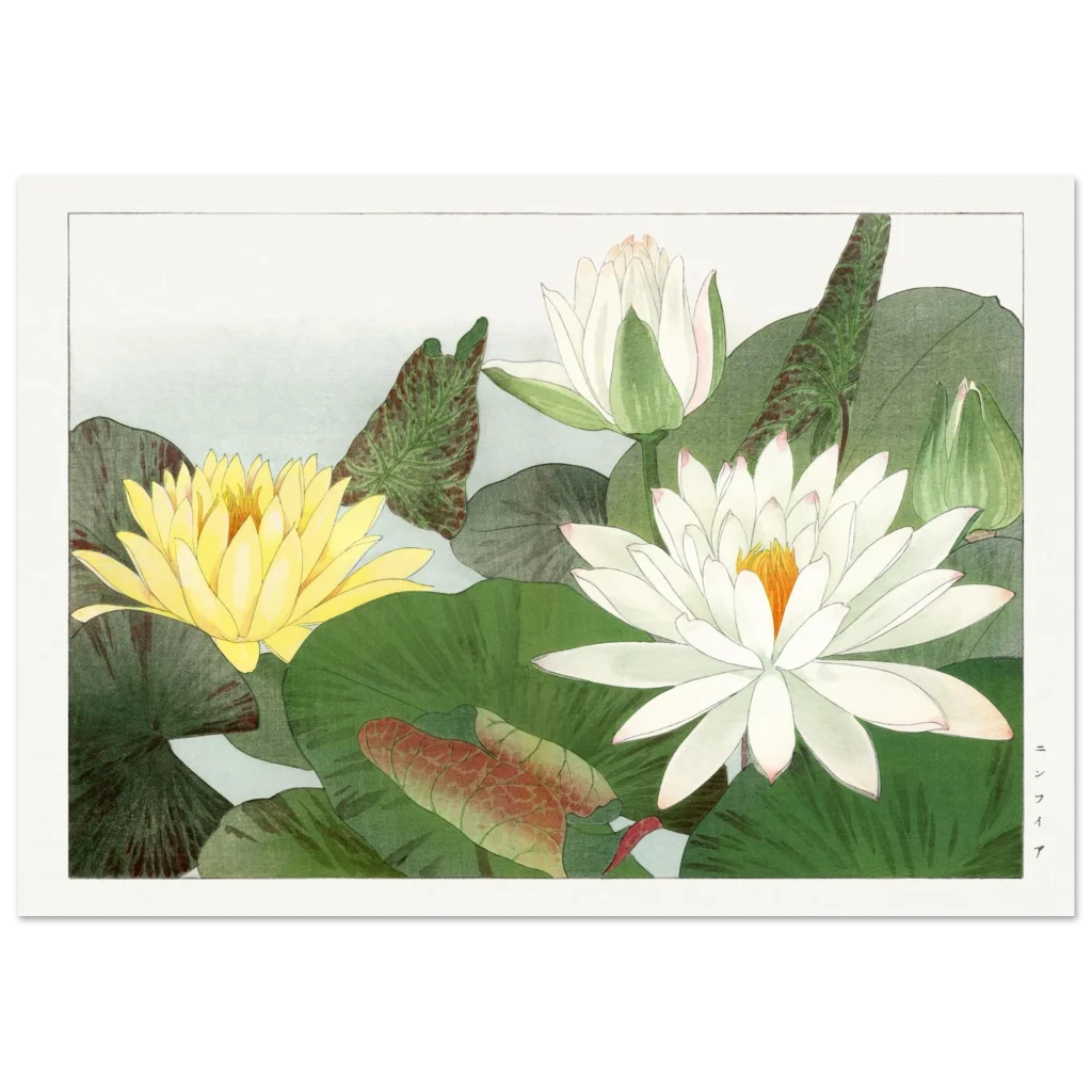 Bring the tranquil beauty of a Japanese water garden into your home with our Zen Lily Pond Ukiyo-e Premium Matte Poster. This exquisite piece, inspired by classic Japanese art, captures the serene elegance of delicate water lilies in soft whites and a vibrant yellow, nestled amongst lush green and subtle red-tinged leaves. It’s a perfect accent to infuse any space with a sense of calm and natural beauty.